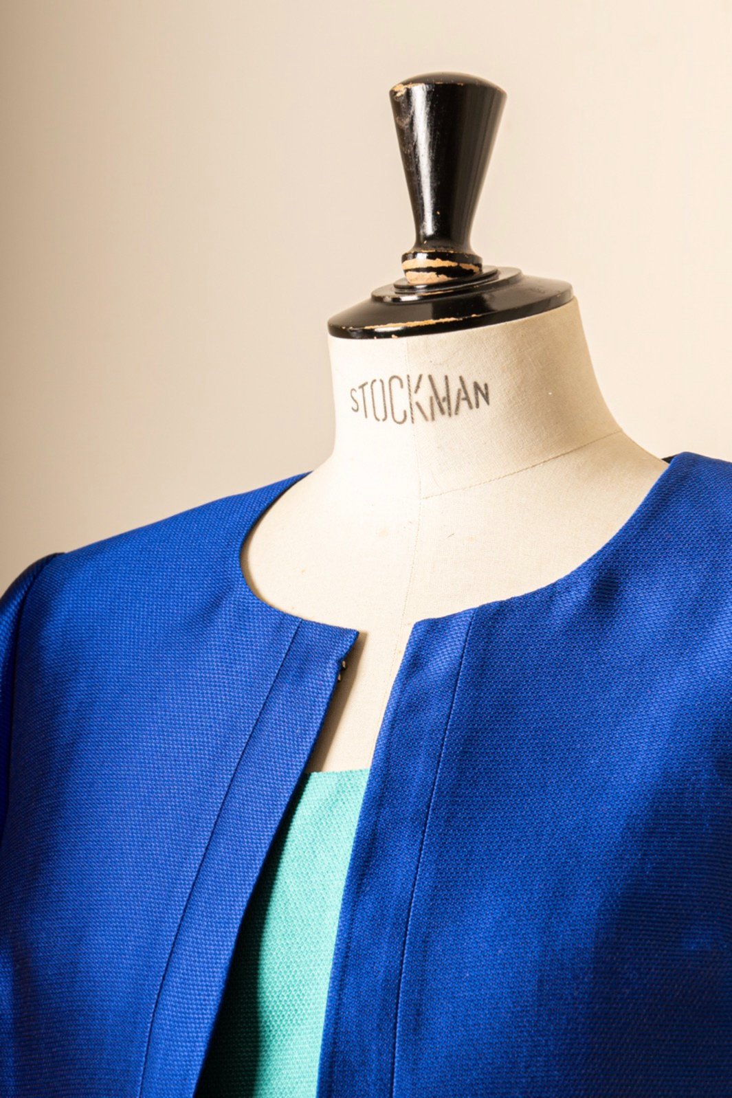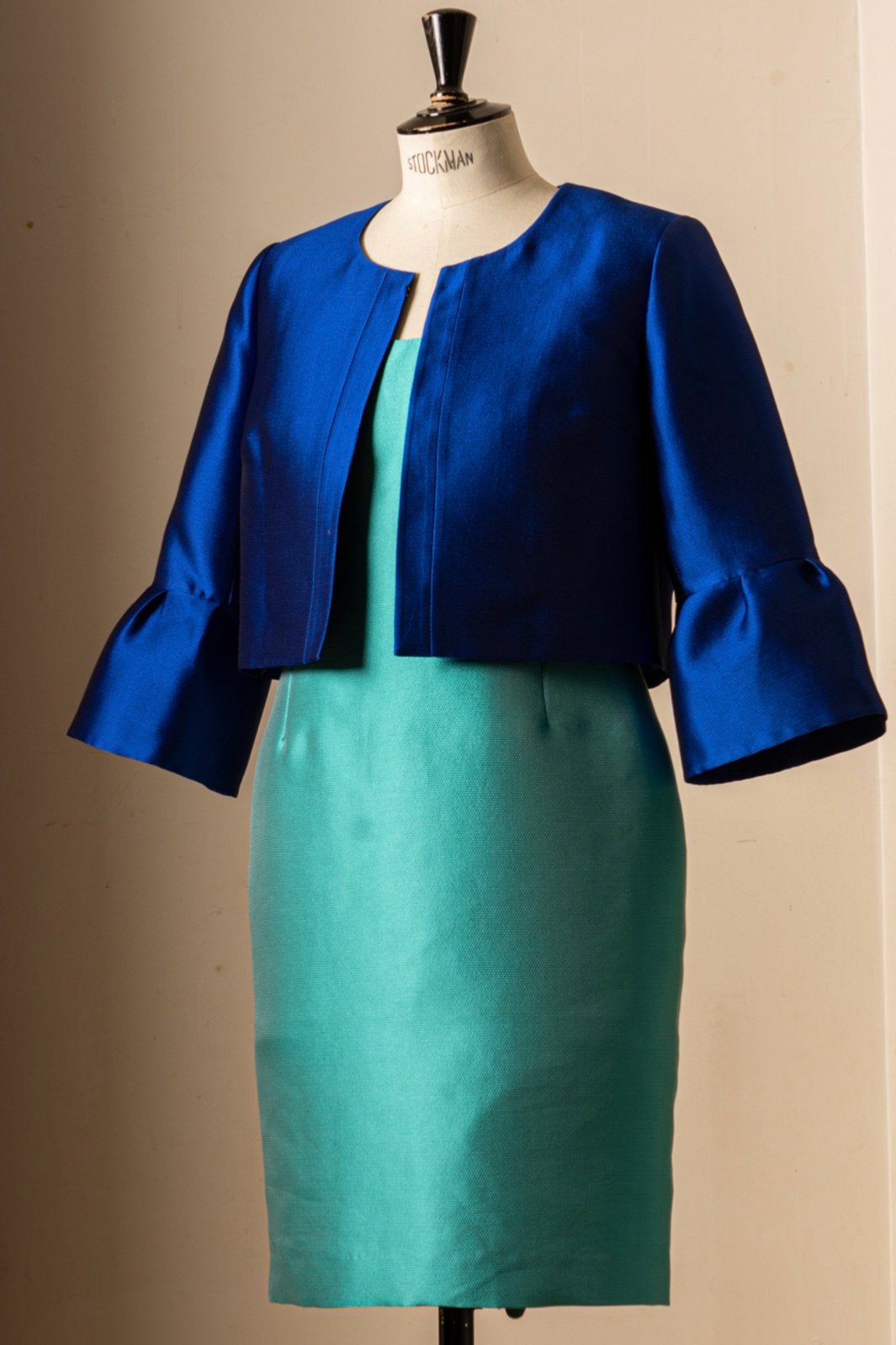 Courte et forme boite, encolure ronde fermeture bord à bord, à manches longues, assortie à une superbe robe à encolure découpe cur ultra féminine. Cette robe découpes princesse, courte, à petites manches combine un crêpe doux et souple à un mikado soyeux imprimé de larges fleurs effet peinture pour un style arty esprit années 50.