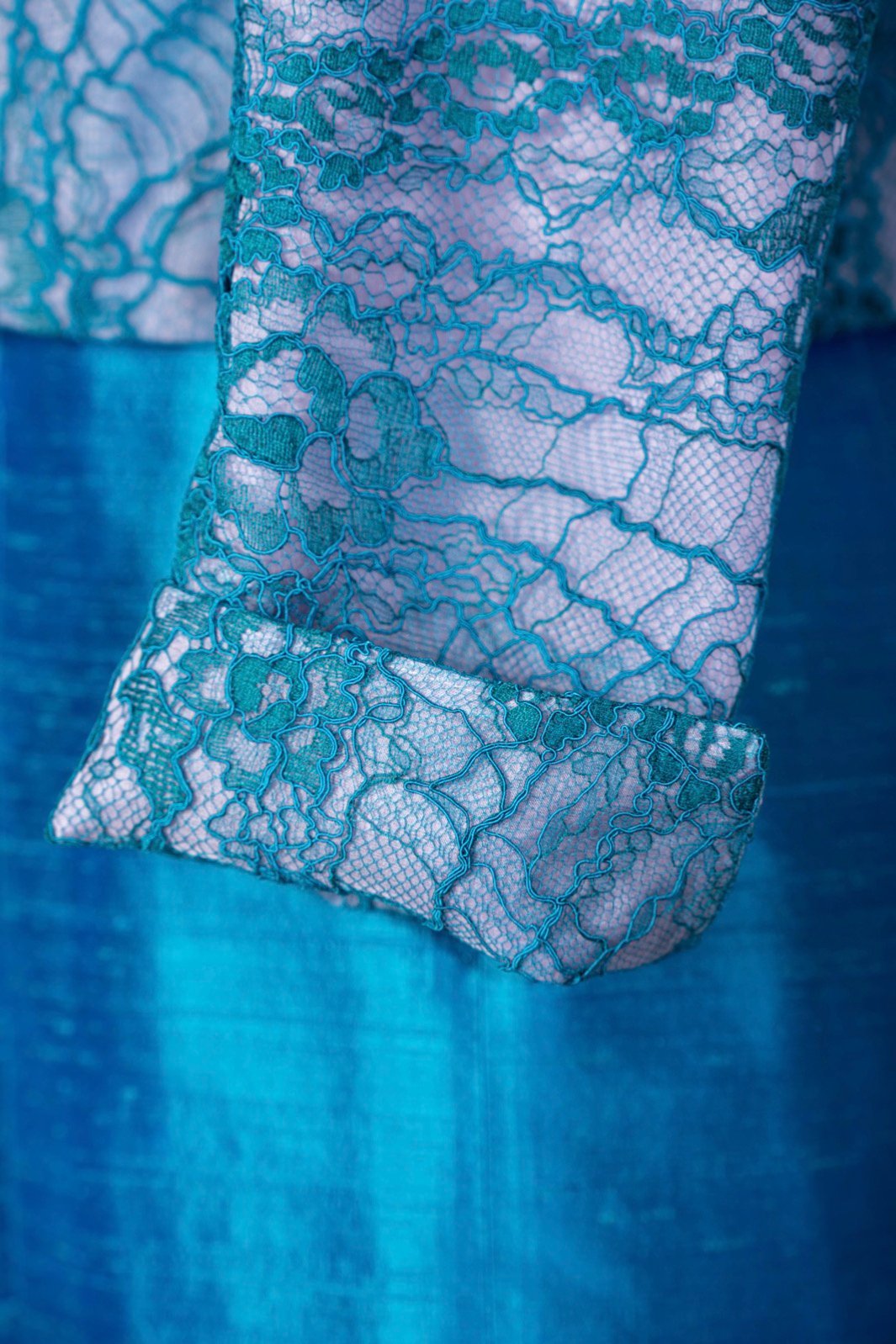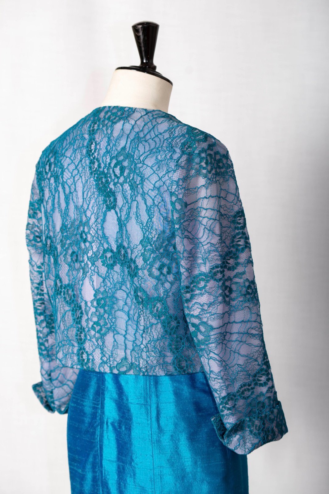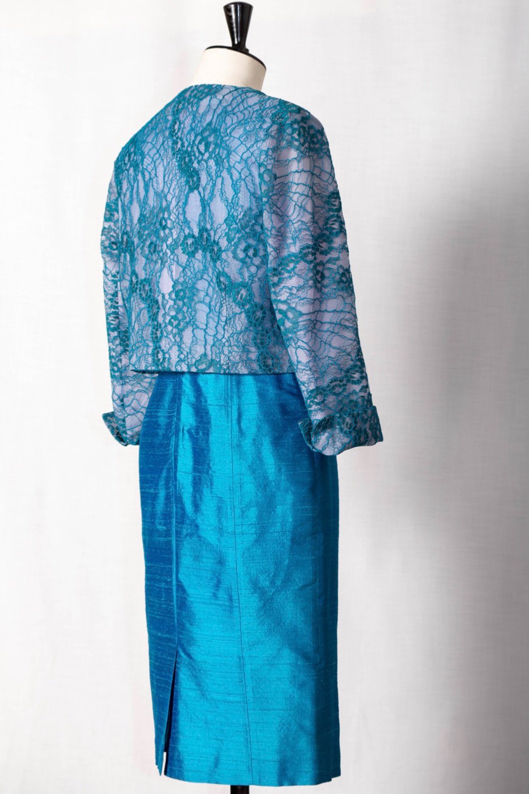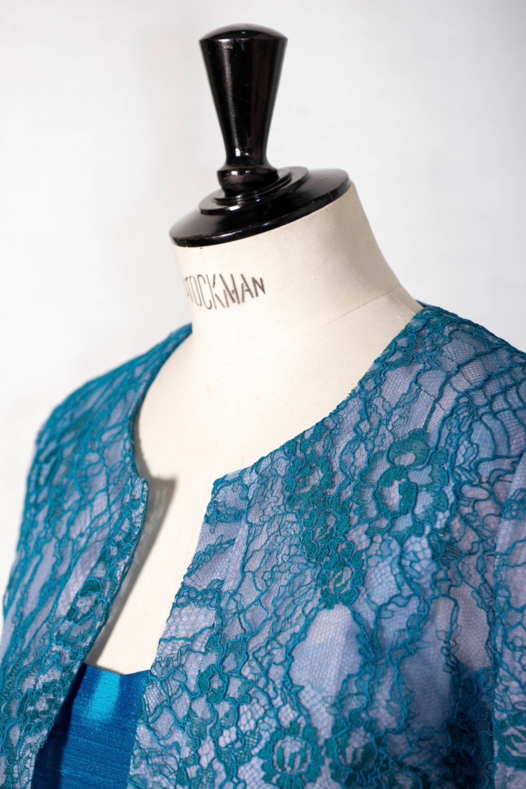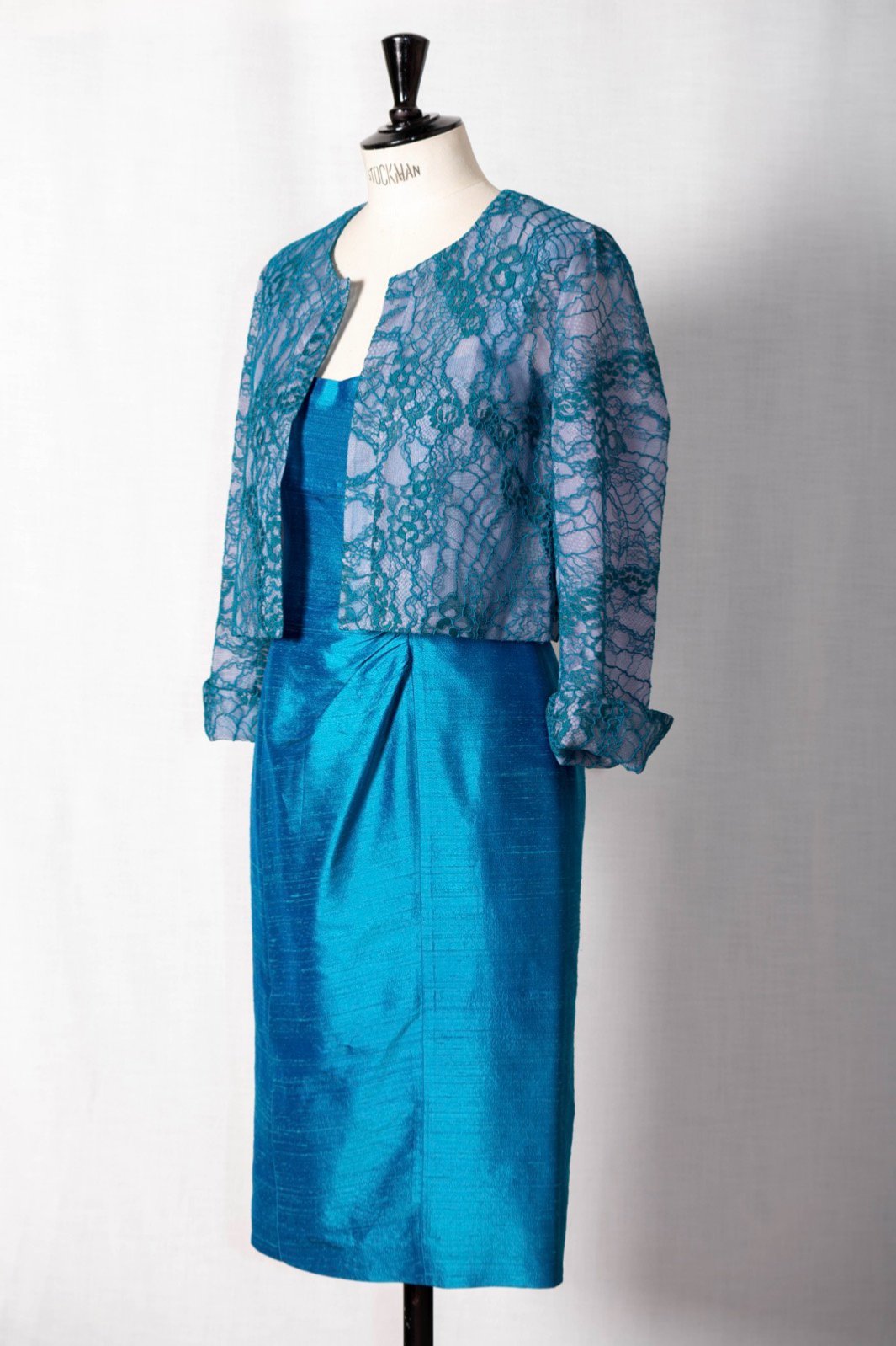 Courte et forme boite, encolure ronde fermeture bord à bord, à manches longues, assortie à une superbe robe à encolure découpe cœur ultra féminine. Cette robe découpes princesse, courte, à petites manches combine un crêpe doux et souple à un mikado soyeux imprimé de larges fleurs effet peinture pour un style arty esprit années 50.