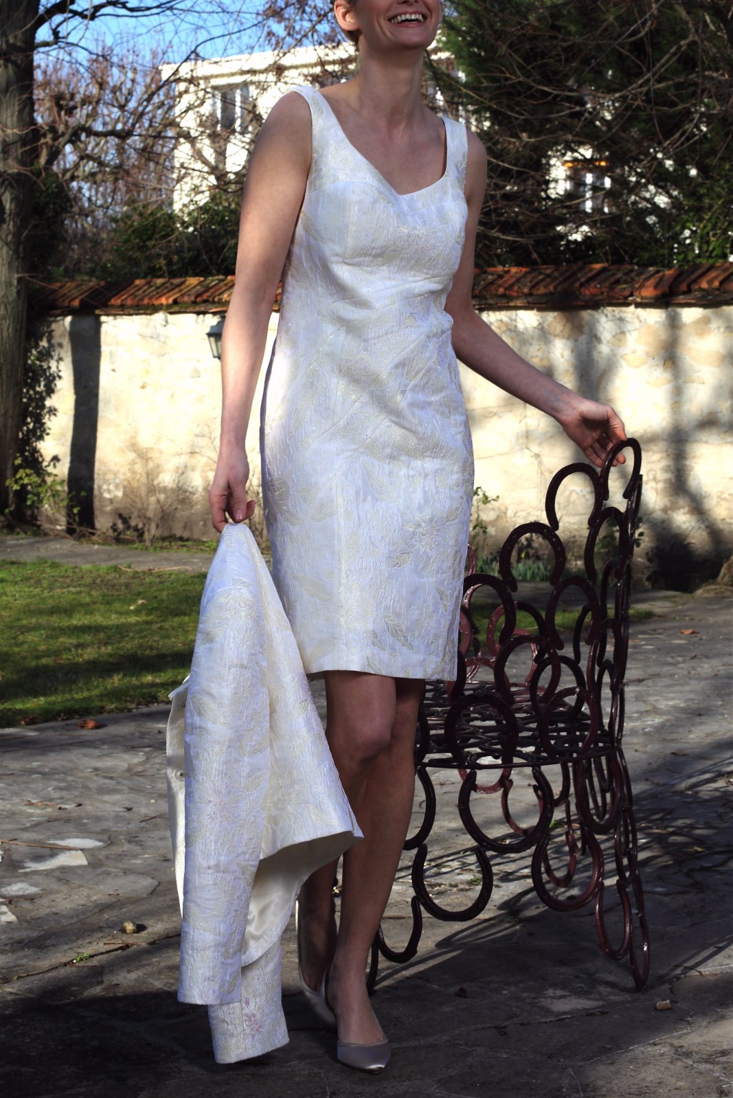 1 Tailleur de mariage robe courte et veste en jacquard brocard T40