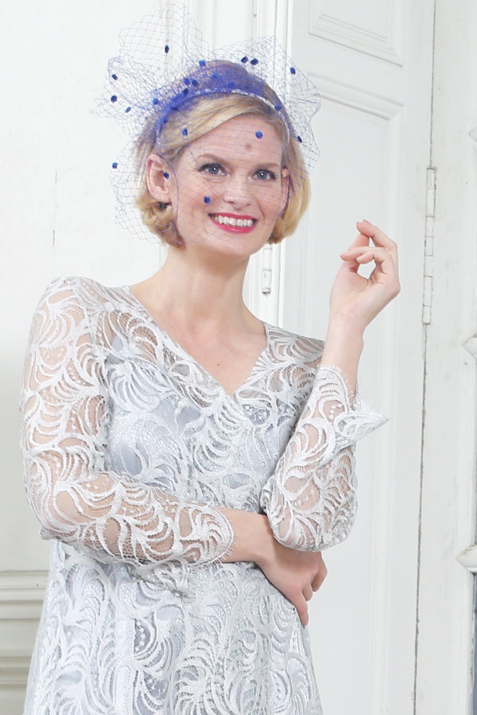 Cette magnifique coiffe de cérémonie est surmontée d’une voilette plumetis très féminine coloris bleu intense.