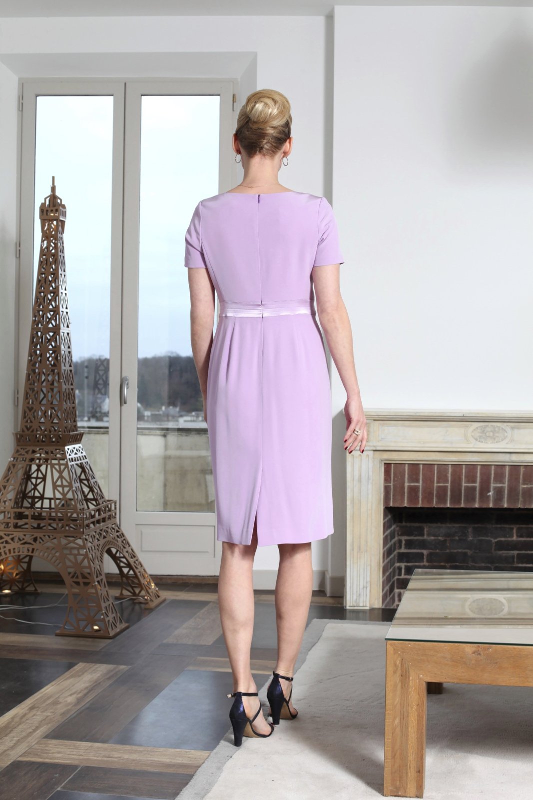 Robe courte de cocktail avec de petites manches, en crêpe fluide et souple, au style simple et très féminin. Sa ceinture en satin au coloris contrasté maintient de petits plis qui apportent confort et souplesse à cette robe légèrement entravée. Une belle encolure bateau pas trop large mettra en valeur votre port altier. Proposée ici dans un coloris mauve idéal pour une cérémonie ou un mariage à la campagne.