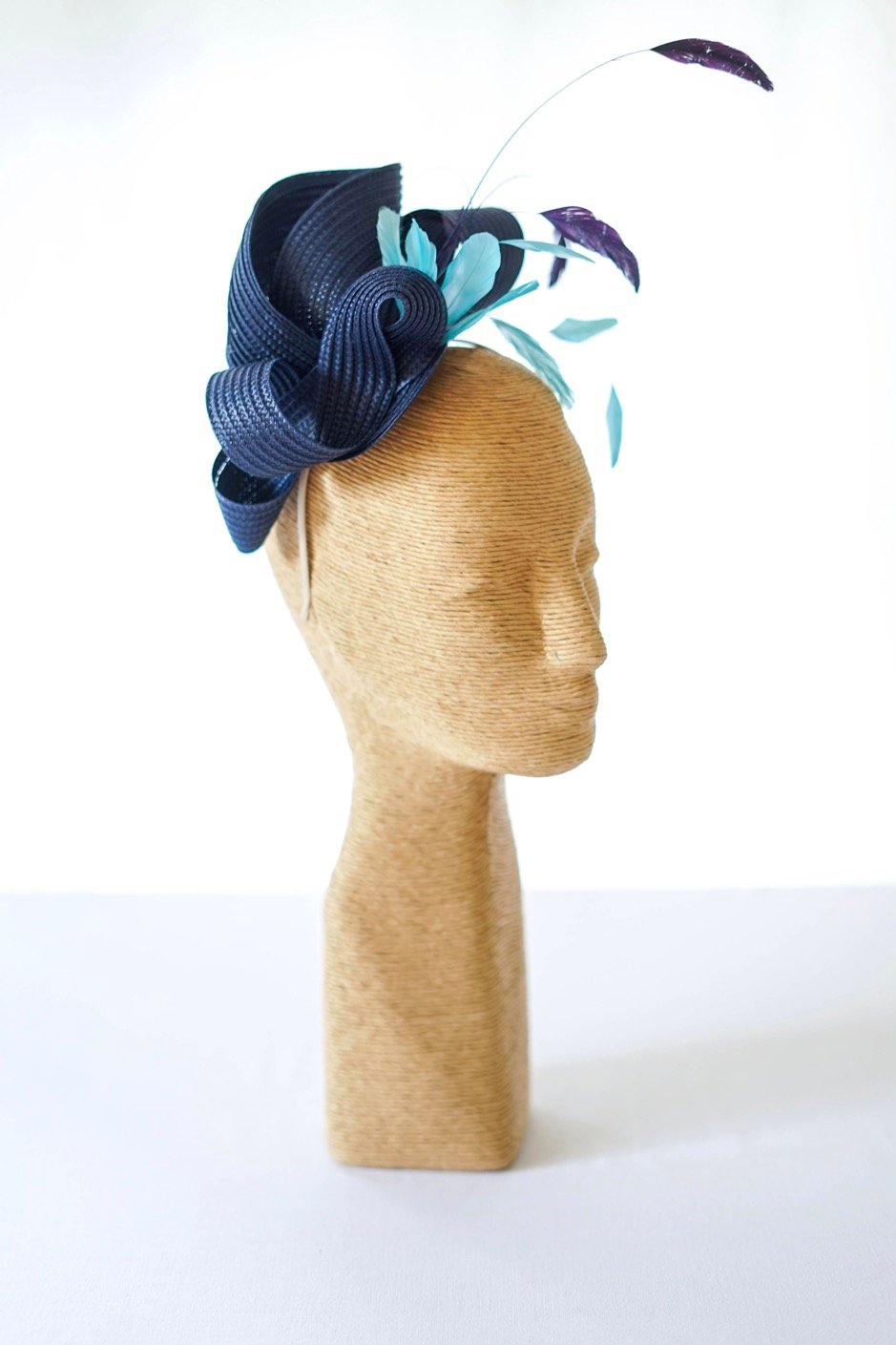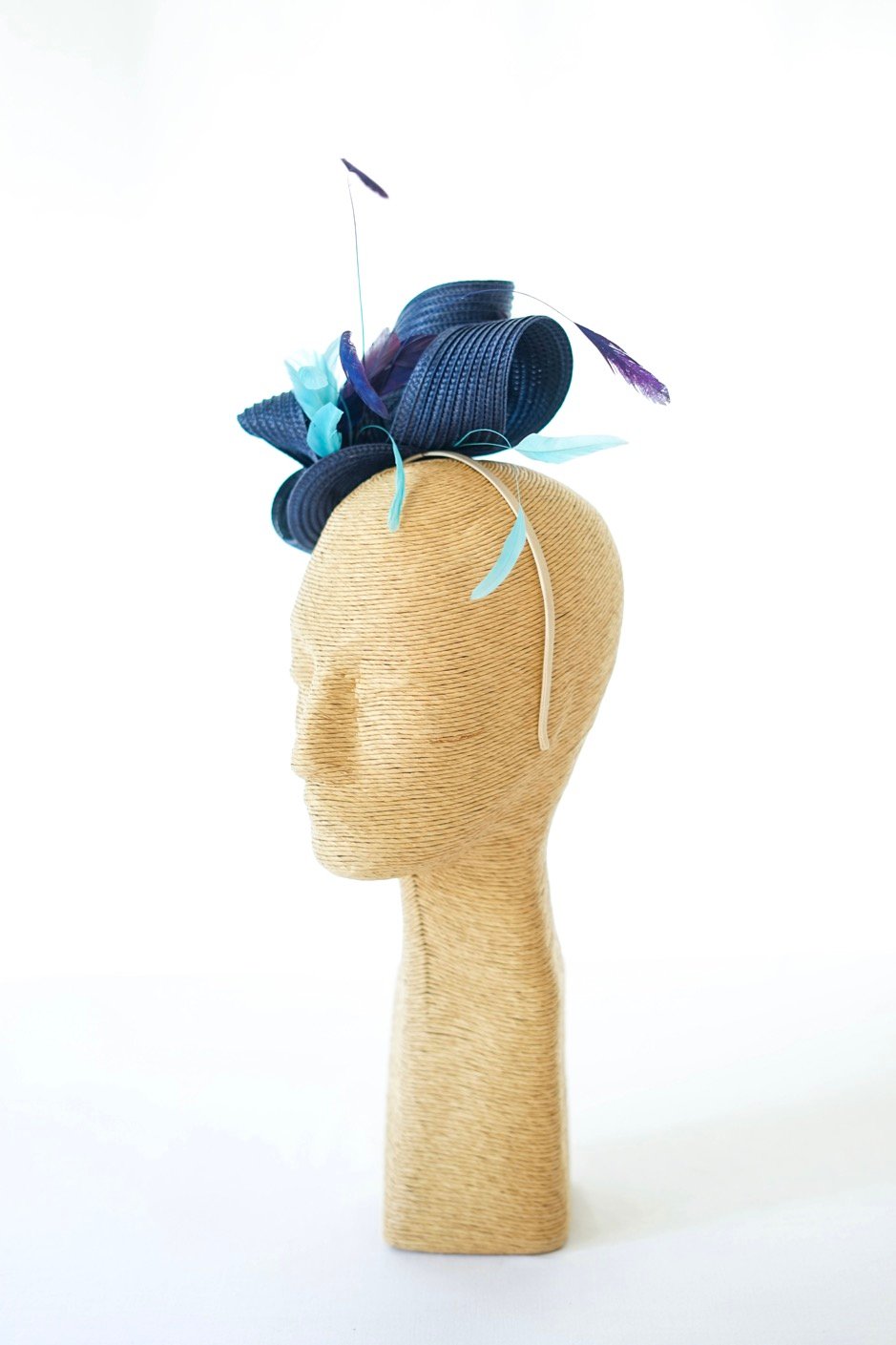 Coiffe mariage OFELIE en ruban de paille cousue et plumes de coq indigo et Aqua.