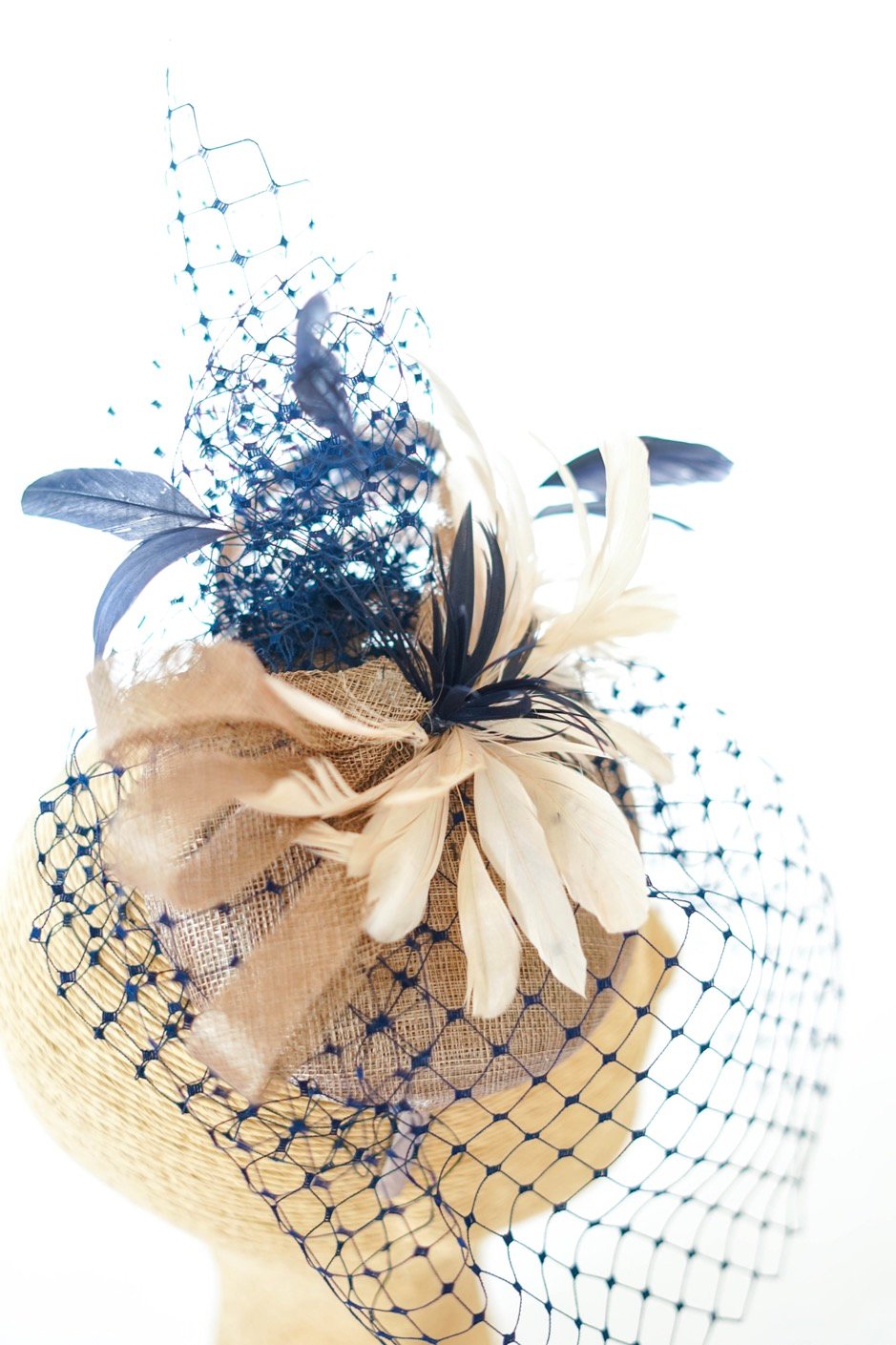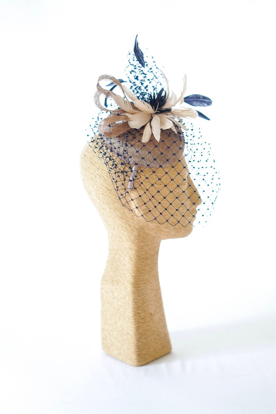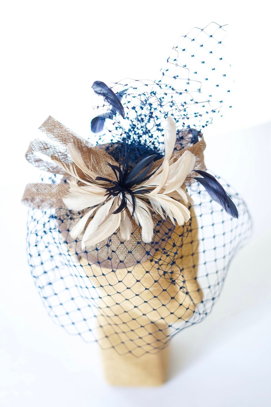 Bibi de mariage DUCHESSE . Noeud en sisal, plumes de coq et voilette praline et marine.