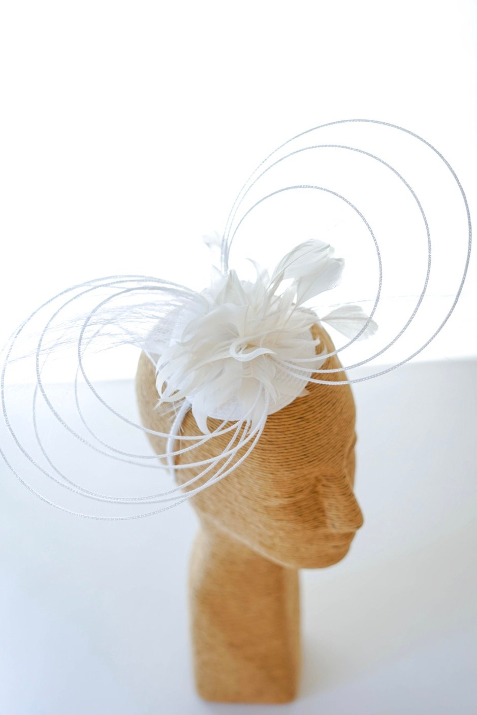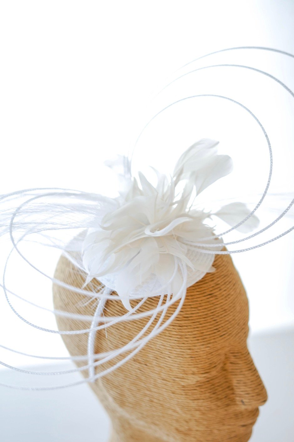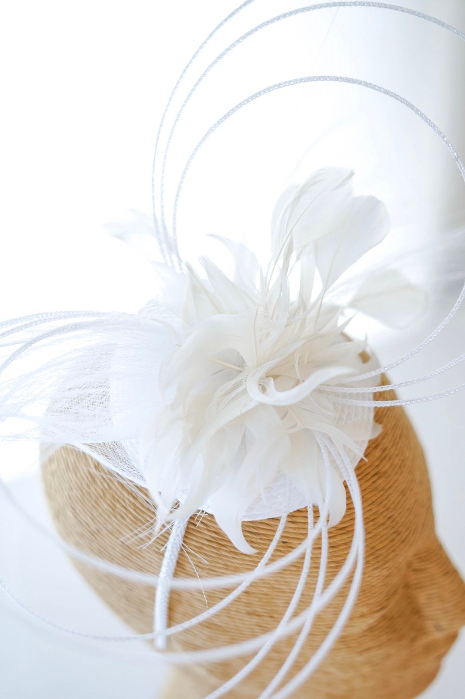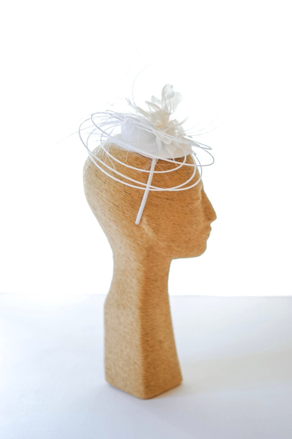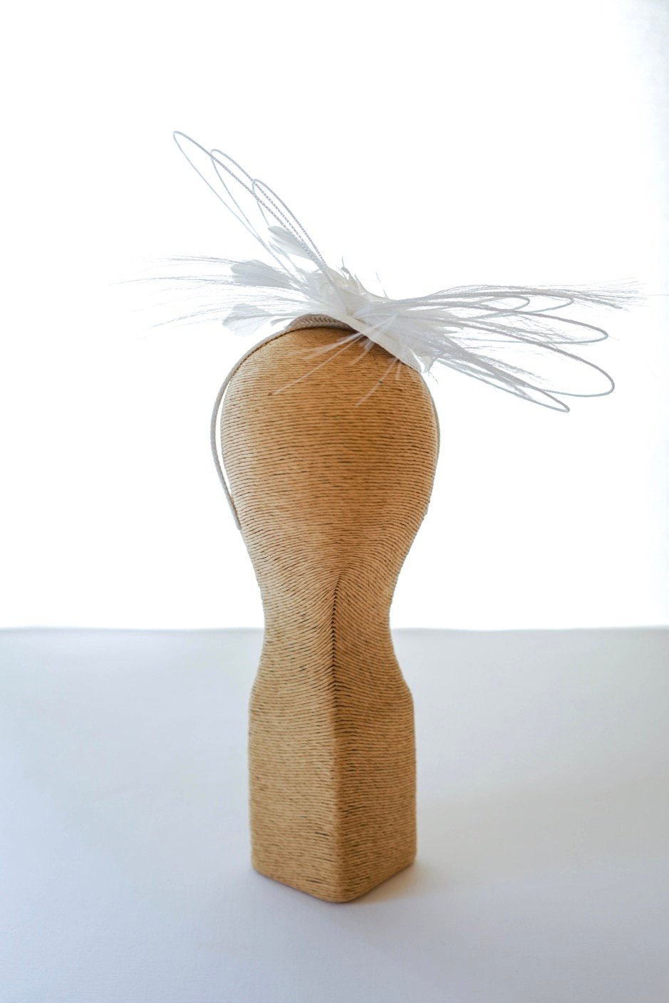 Superbe Bibi de mariage serre tête SAINT MALO avec calotte à plumes de coq et ruban articulé ivoire.