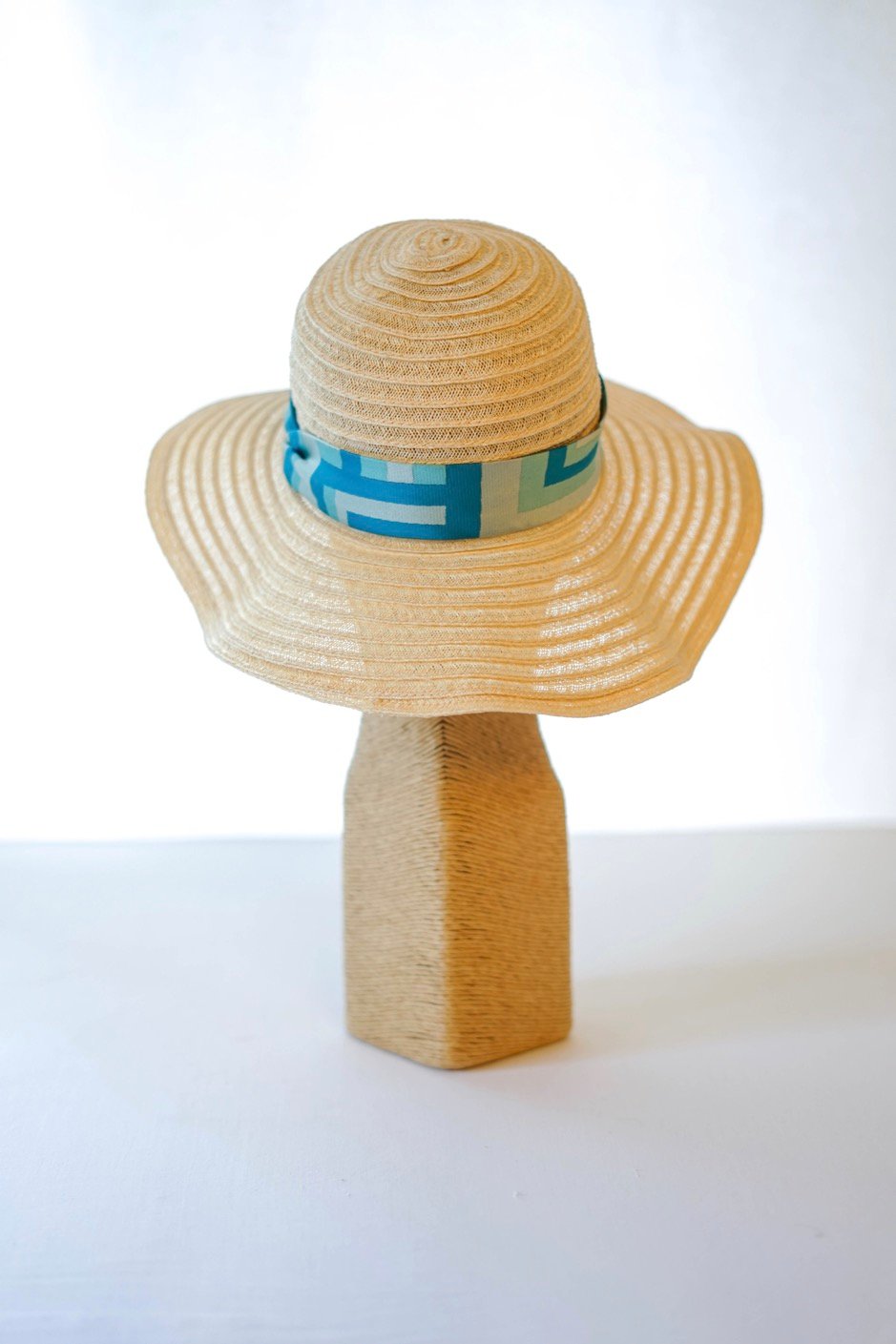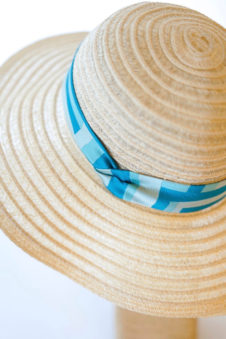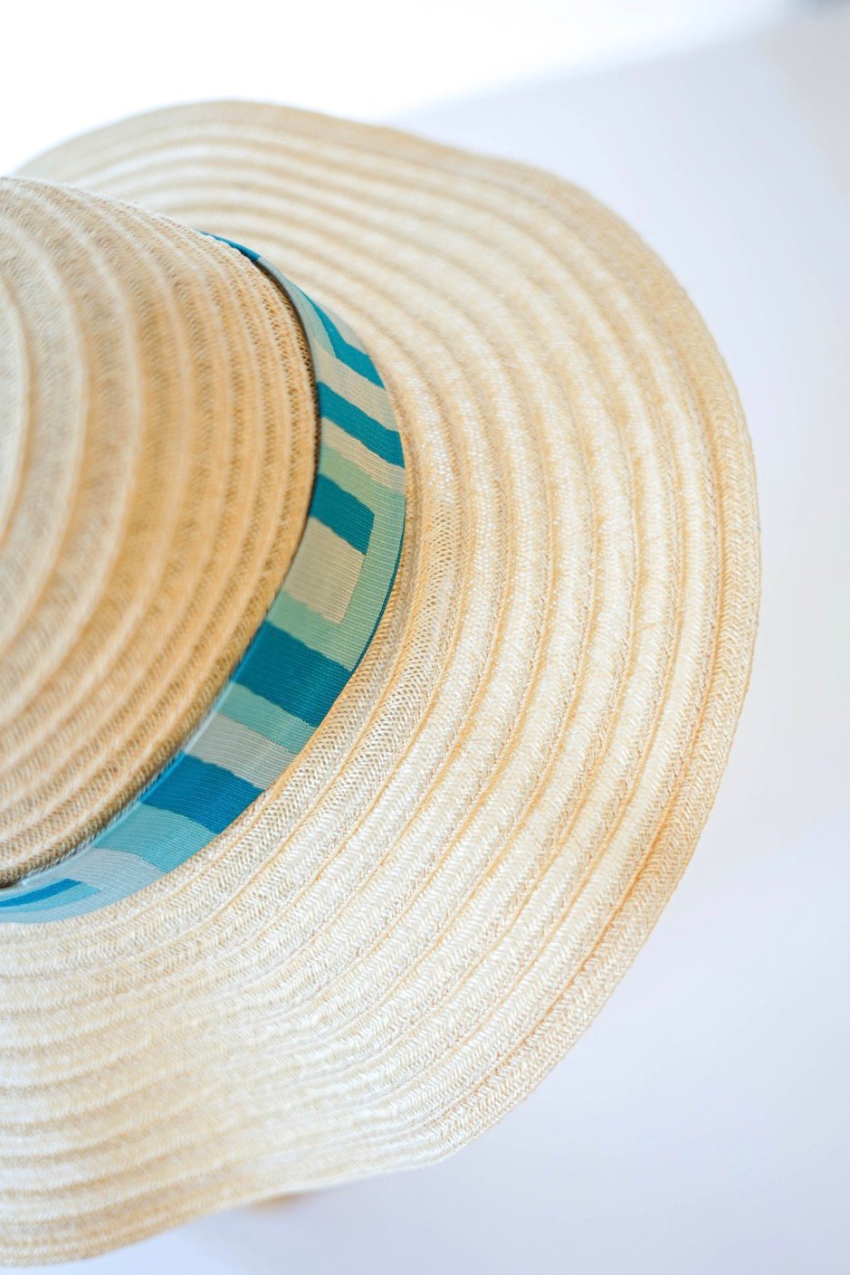 Capeline cloche champagne en ruban de paille cousue pour invitée au mariage ou cérémonie décontractée.