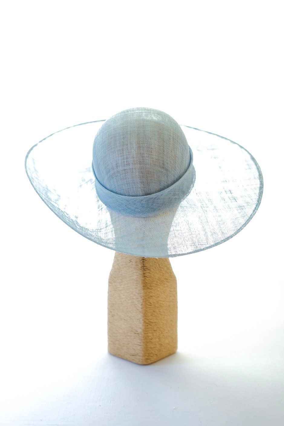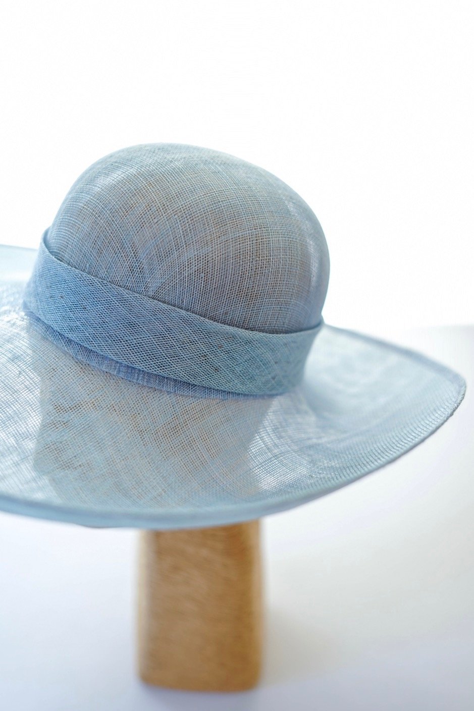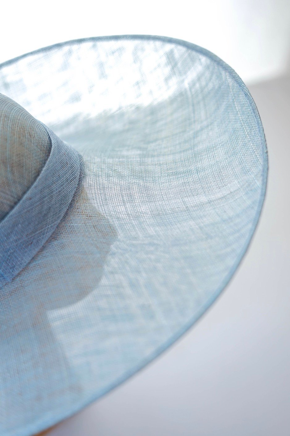 Chapeau capeline bleu ciel et élégante en sisal à bord relevé pour cocktail ou cérémonie élégant et plein été.