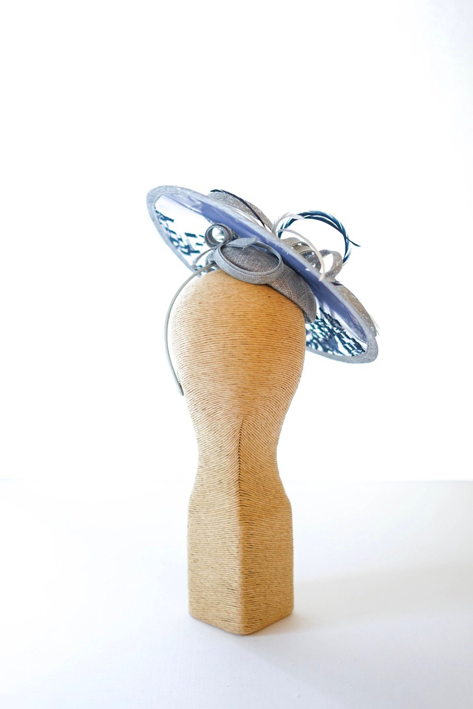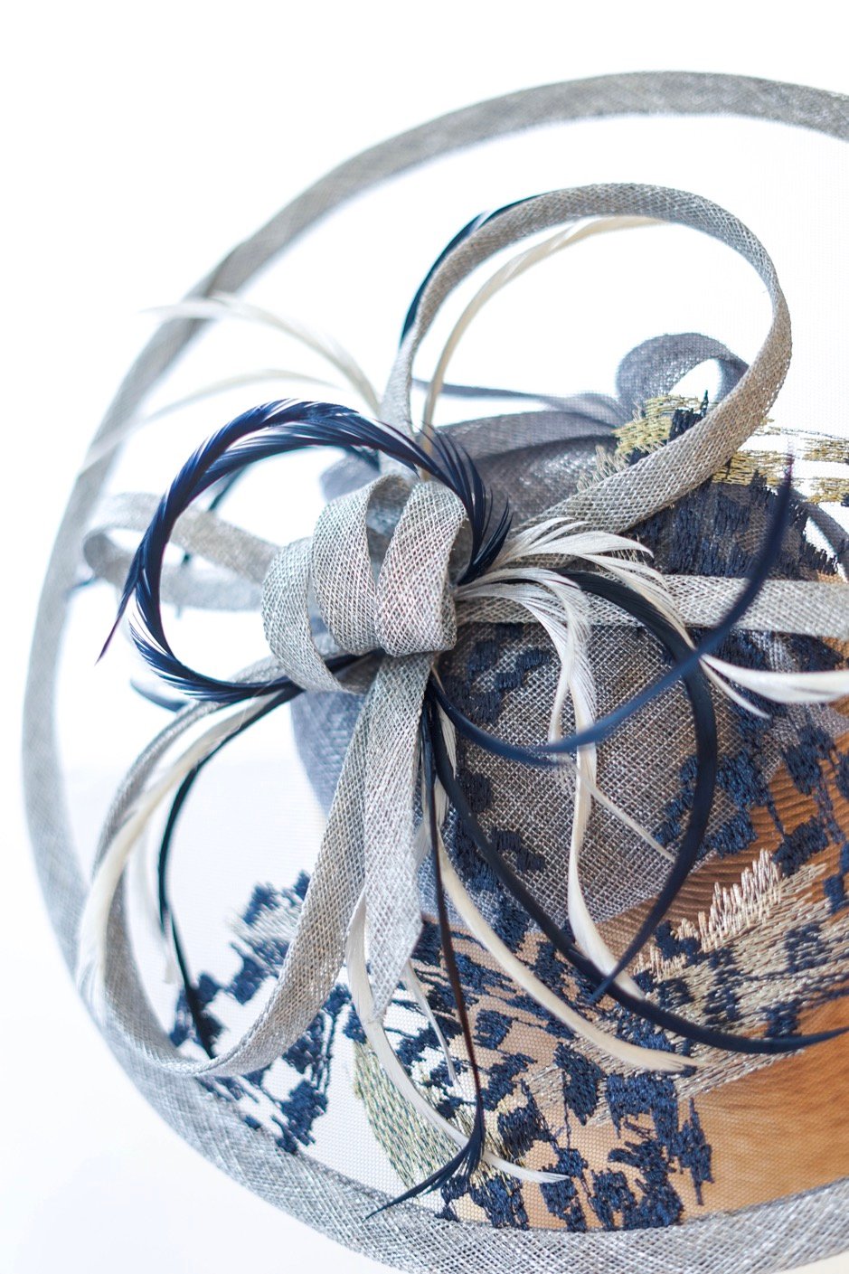 Chapeau élégant pour cérémonie MONALISA En dentelle indigo ,ruban de sisal et plumes de cygne