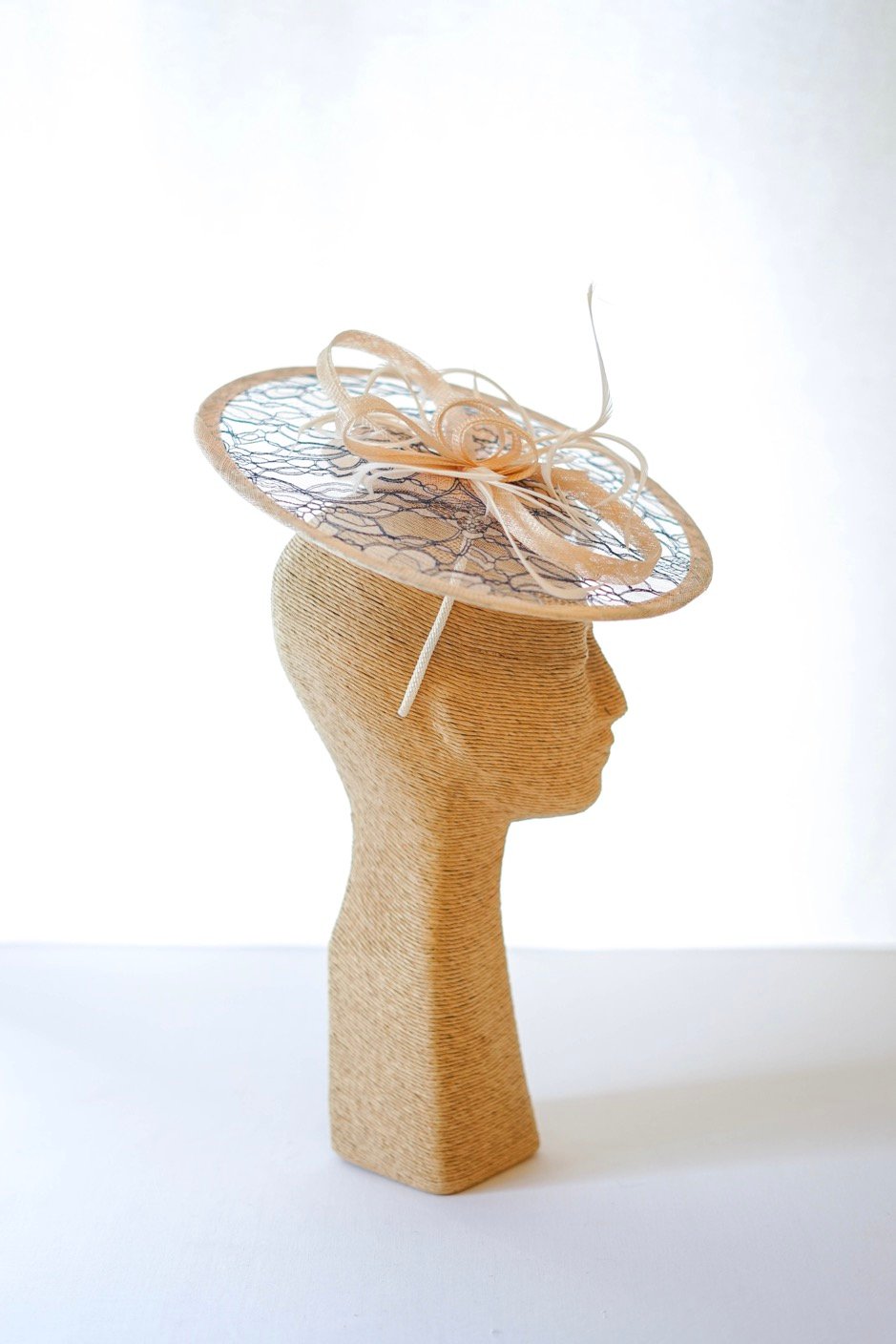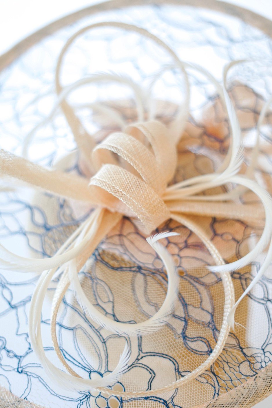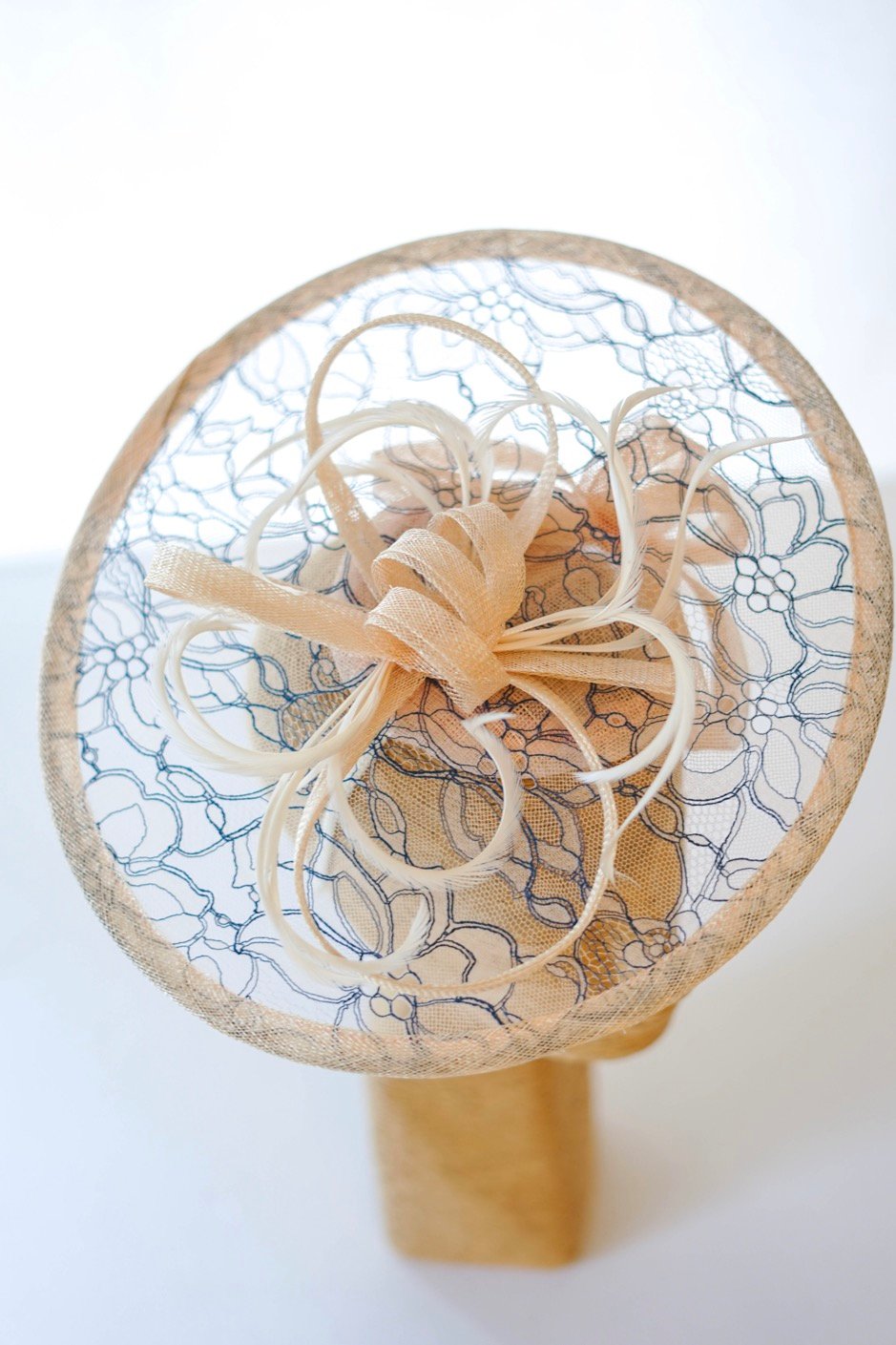 Chapeau élégant pour cérémonie MONALISA En dentelle nude et indigo ,ruban de sisal et plumes de cygne