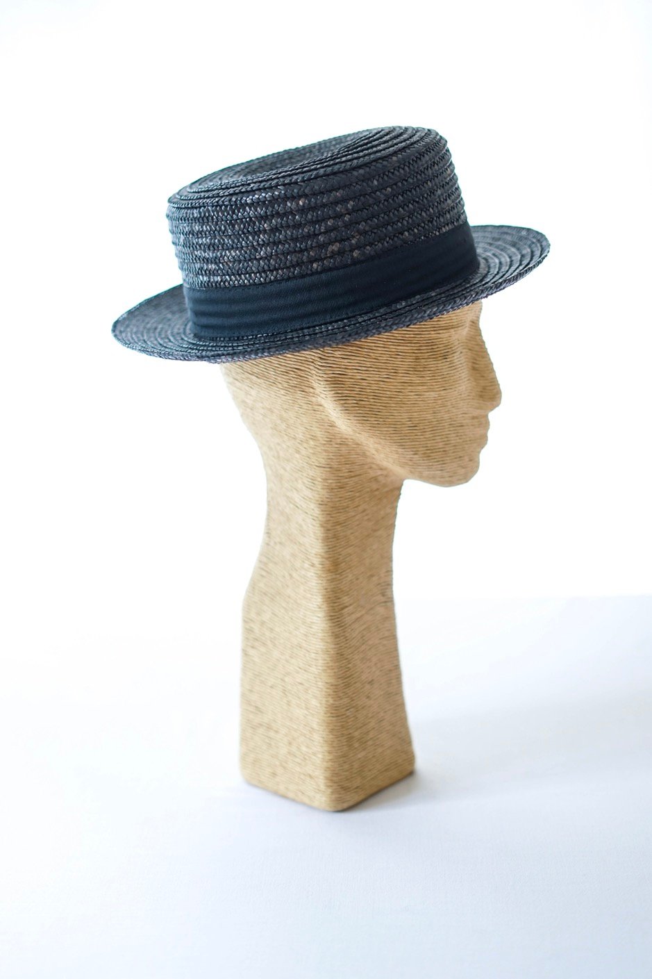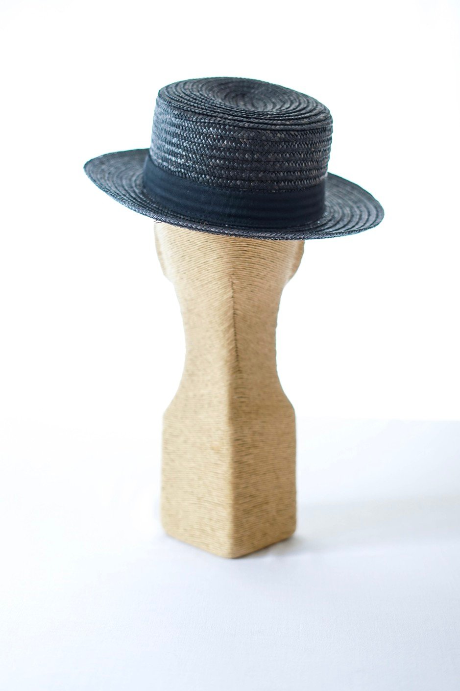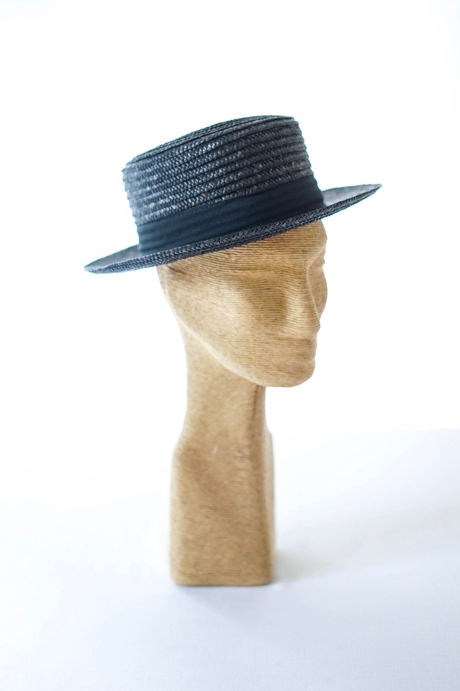 Chapeau canotier noir avec finition ruban reps pour évènement habillé ou tenue de prêt-à -porter.