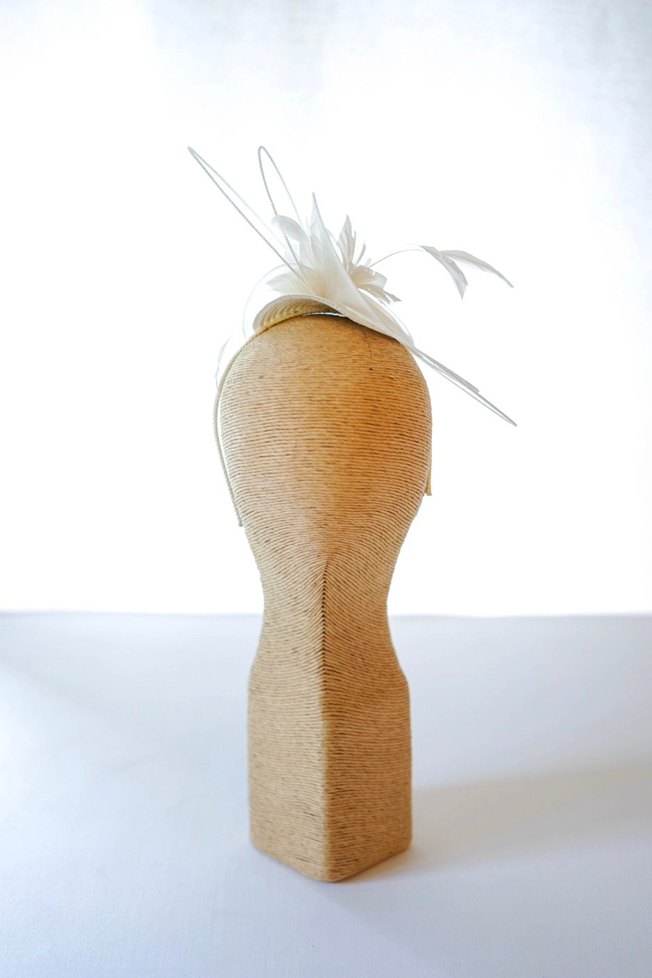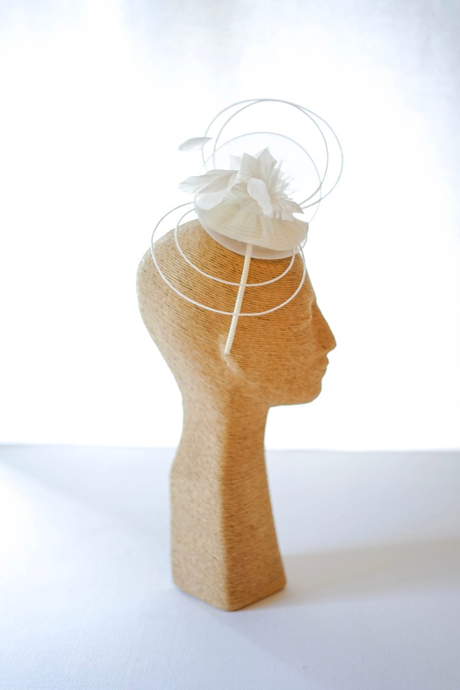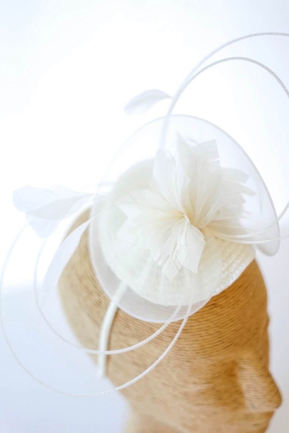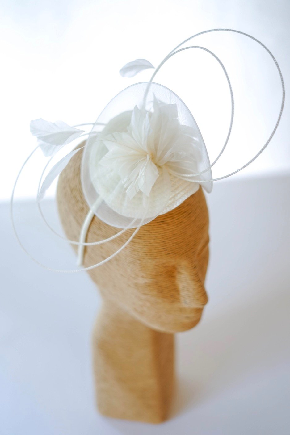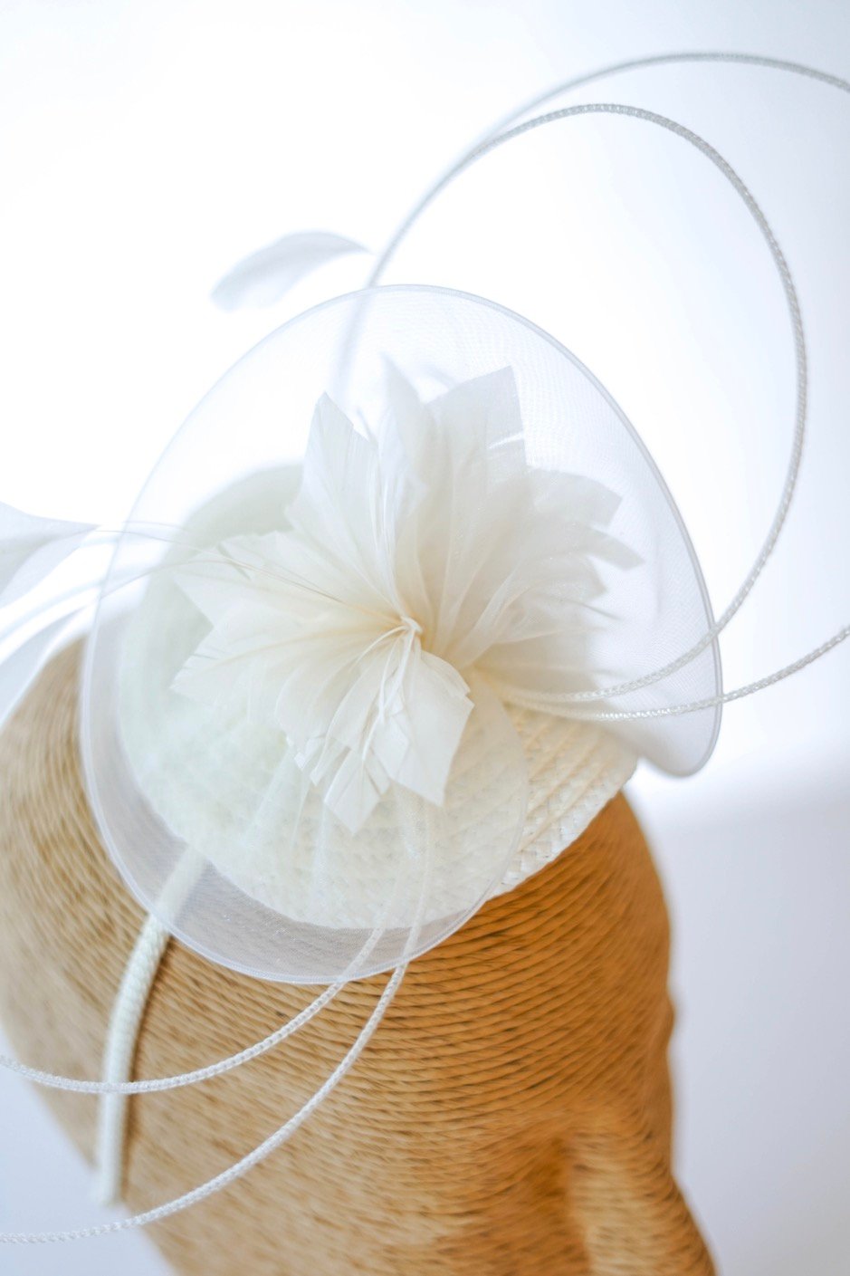 Superbe coiffe mariage civil SAINT MALO organza saturne et plumes de coq, ruban articulé.