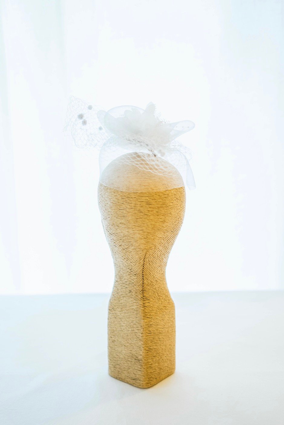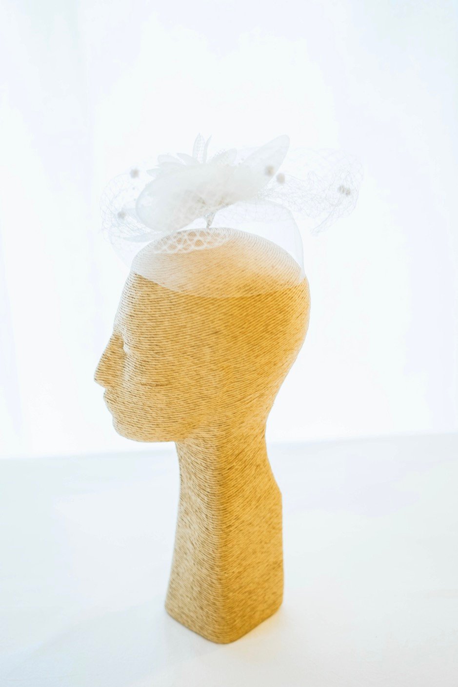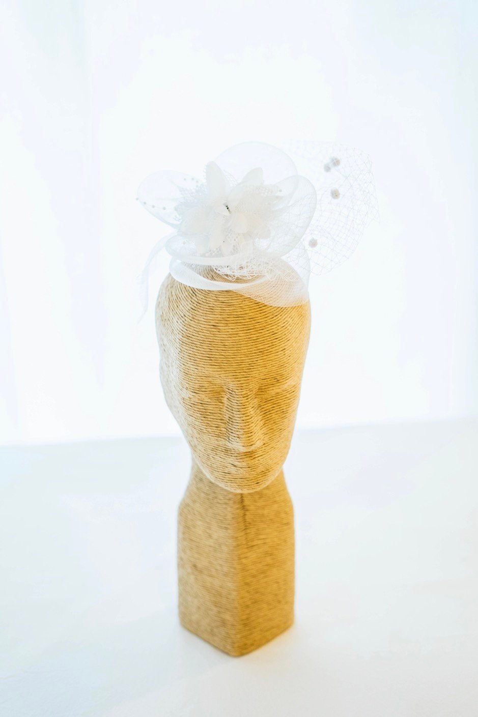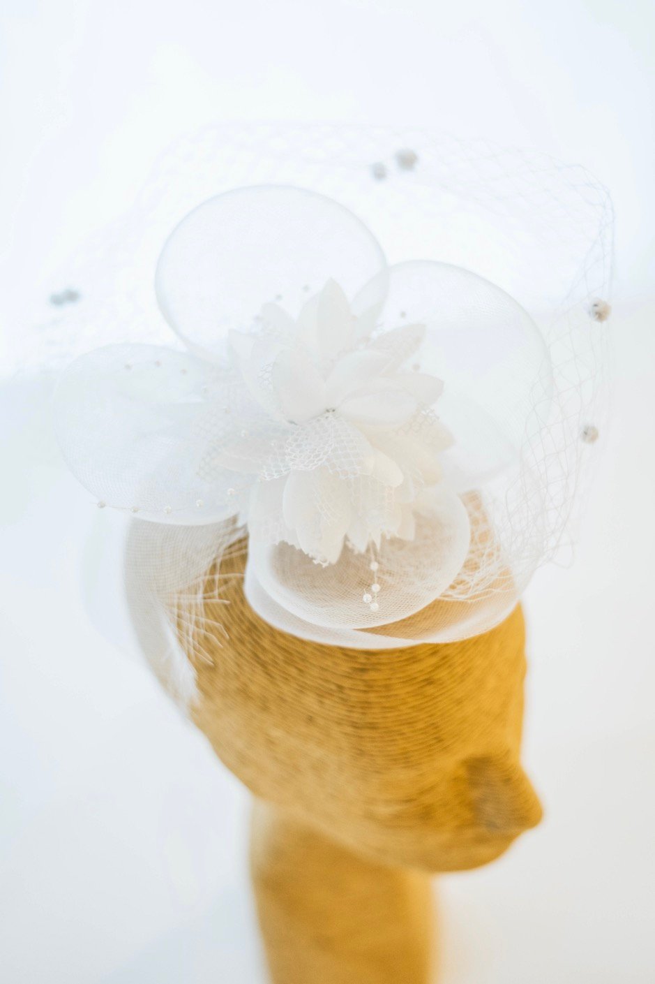 Coiffe pour cérémonie de mariage TE-CHA- CHOU-BLANC.Raffinement du tulle et la fleur blanche.