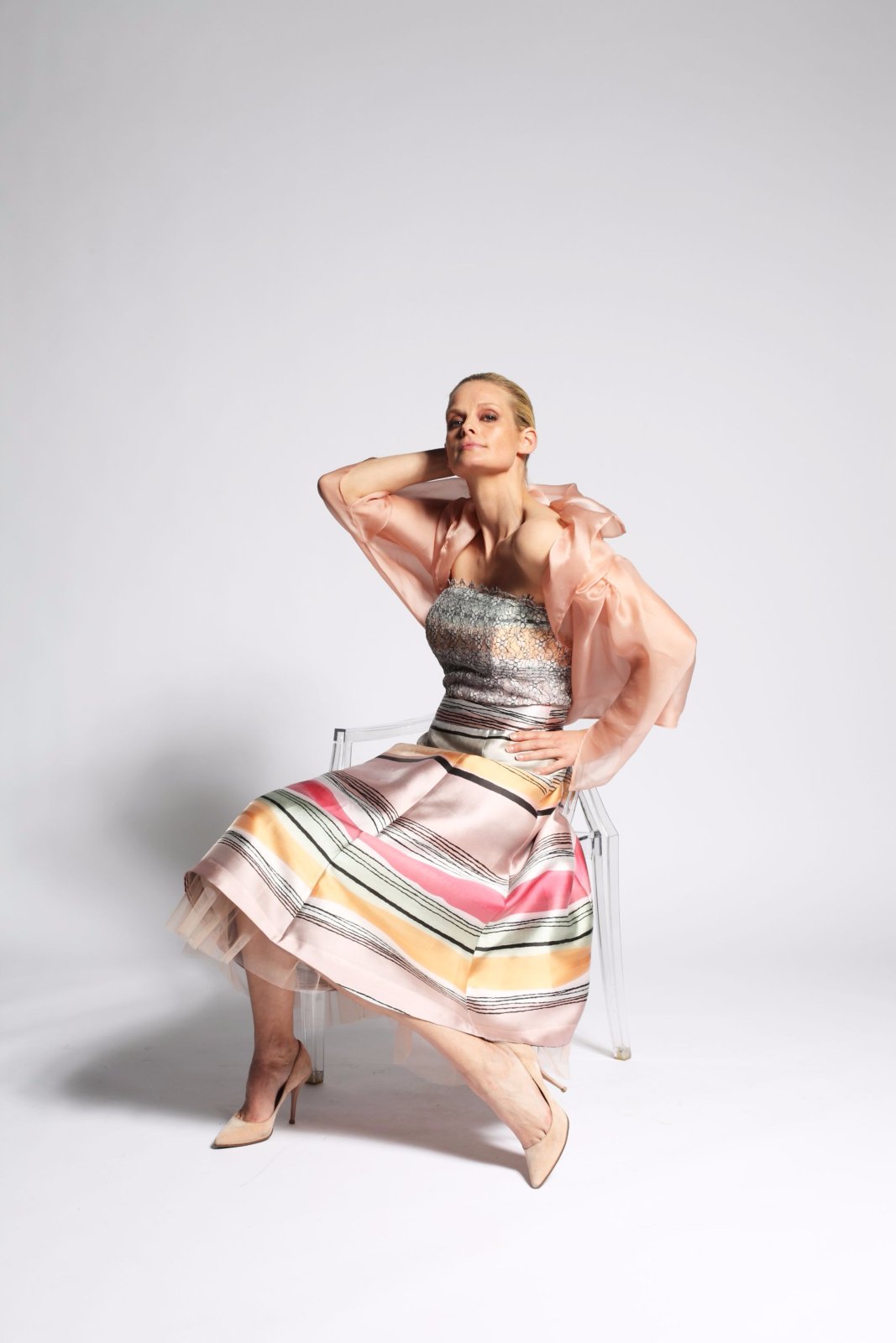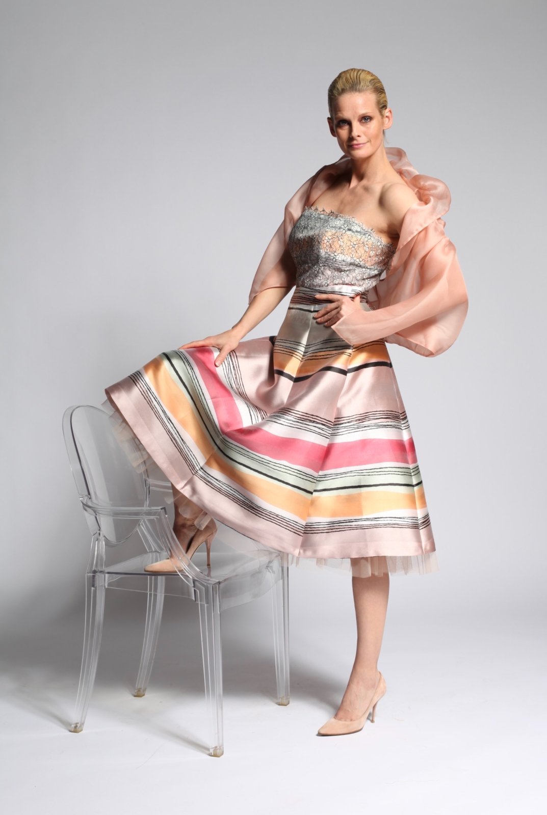 En brocard rayé satiné et dentelle de Calais, sa coupe ajustée vous assure une tenue habillée Couture élégante et chic.
