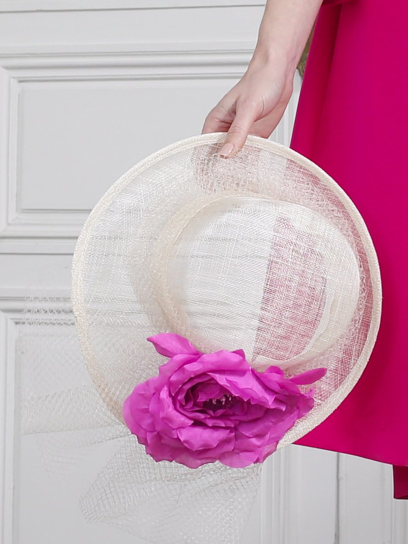Ce magnifique chapeau de cérémonie est un chapeau en sisal blanc cassé avec une magnifique rose en soie