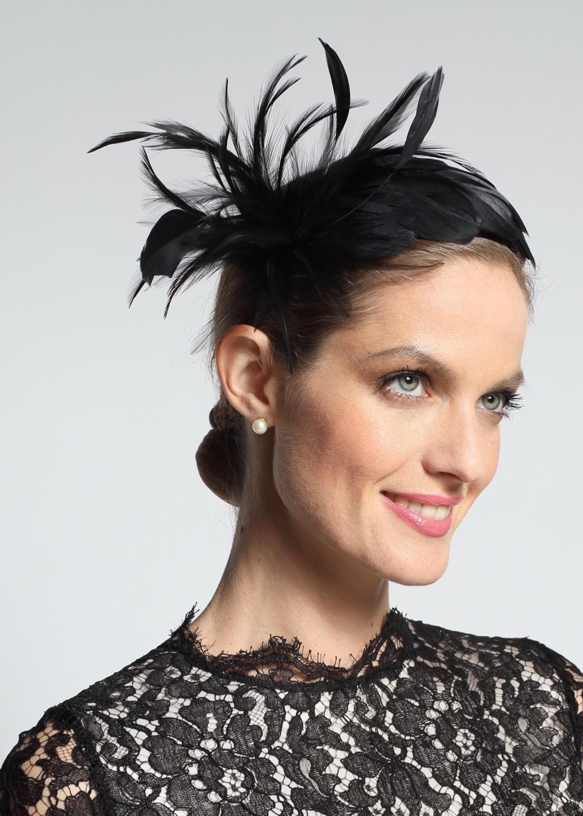 Sublime chapeau en plumes noires monté sur serre-tête très original.