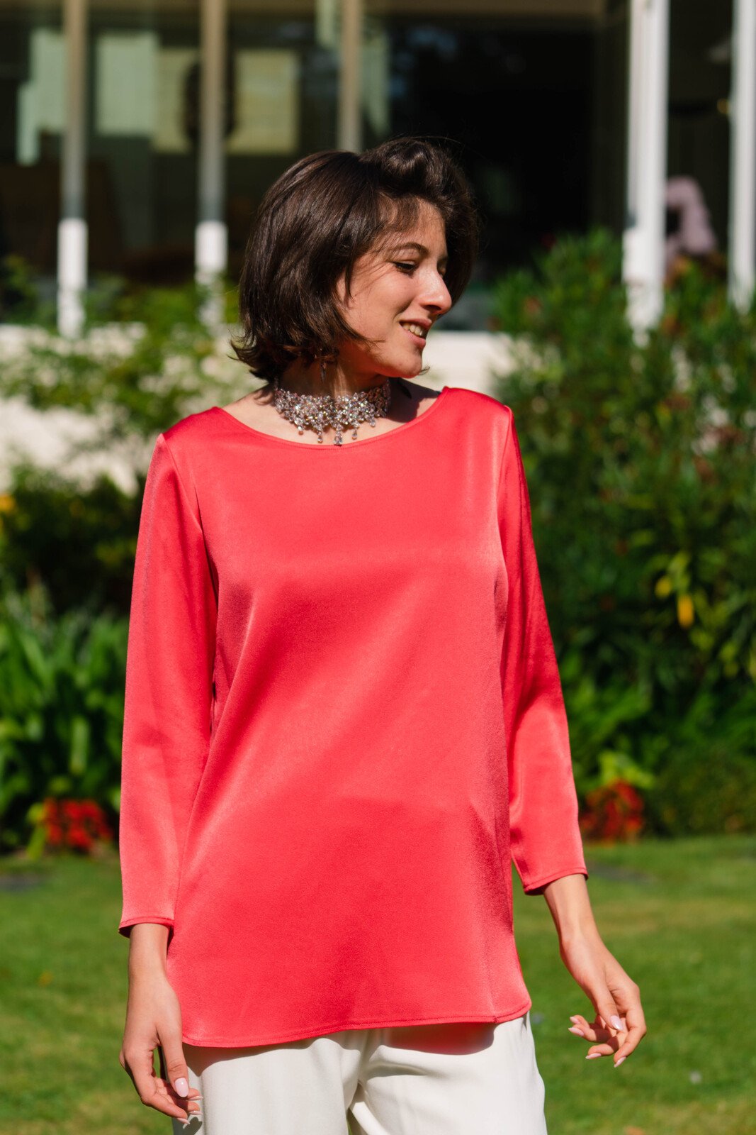 Chic et moderne, ce top en couleur coquelicot est idéal pour des événements raffinés en toutes saisons. souple et léger, il constitue un excellent basique que vous pourrez combiner avec une autre tenue de cocktail pour d’autres occasions. Il s’associera parfaitement avec un pantalon léger ou un pantalon cigarette, ainsi qu’avec un manteau Montana.