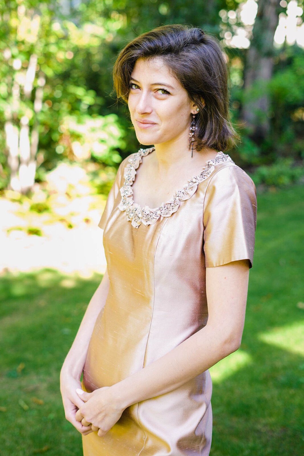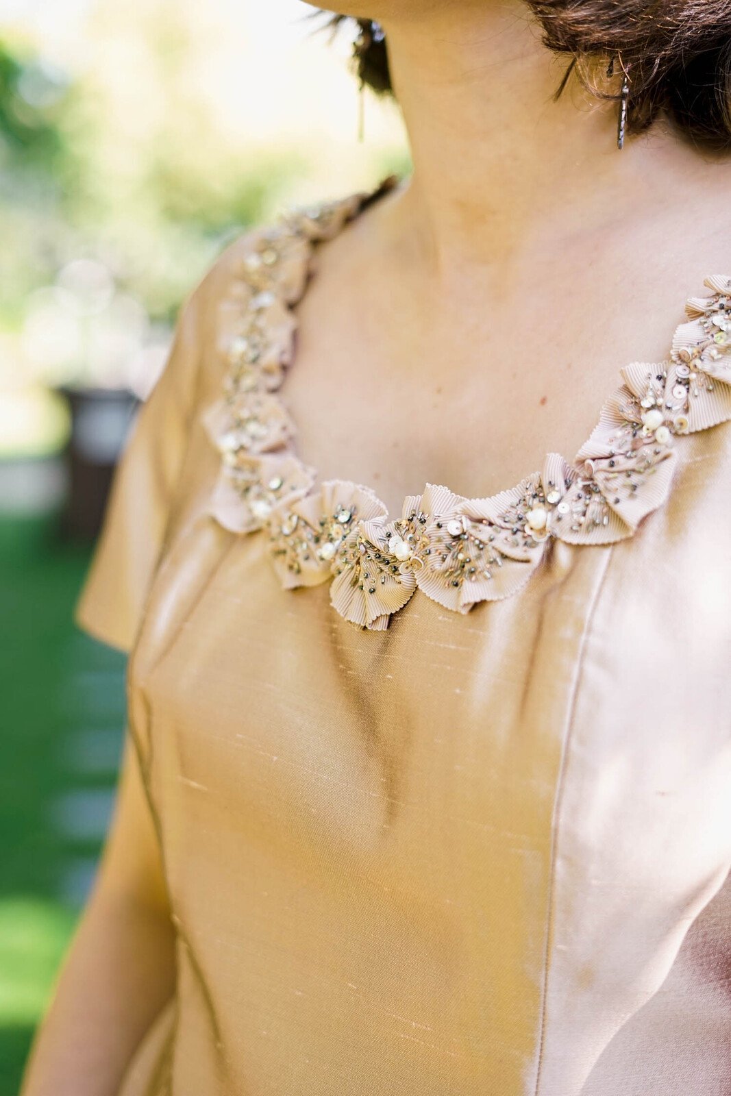 En coordonné, Robe RAQUEL en soie shantung coloris PÊCHE encolure en ruban gros grain brodé main et perlé.Robe droite