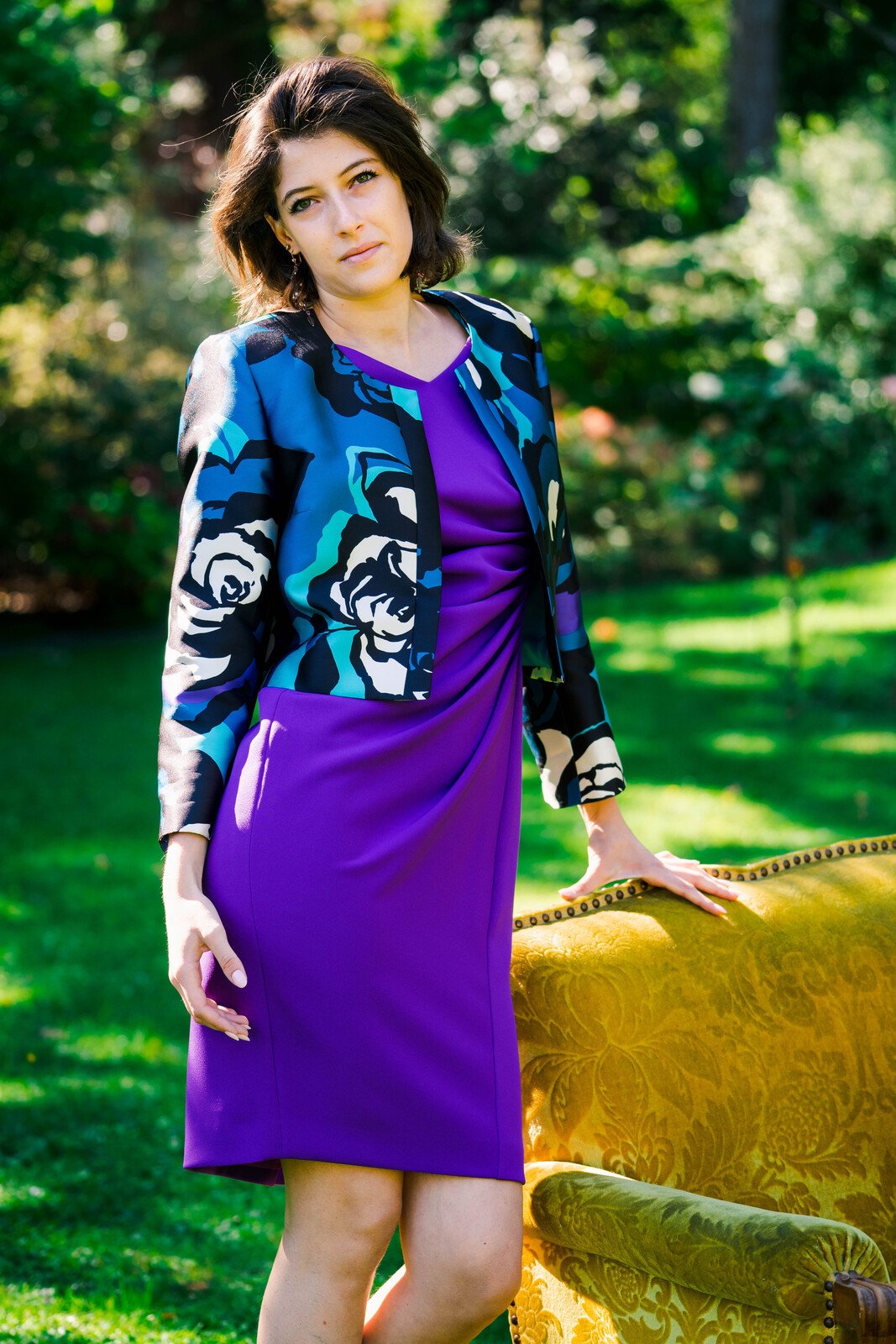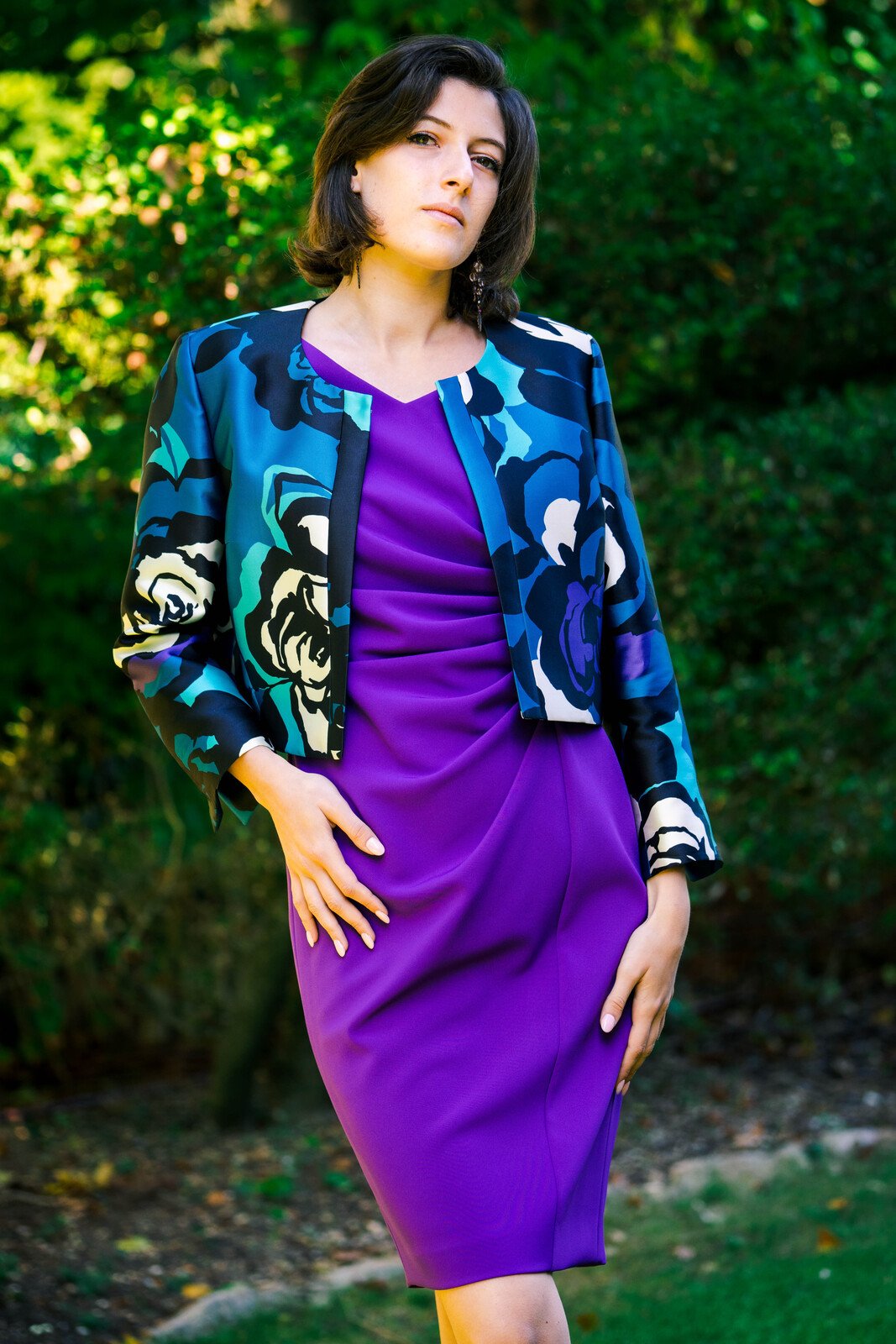 La veste courte THERESE imprimé graphique fleurs Peacock est réalisée dans un coloris très tendance. Complétée par une robe MARINE unie coordonnée, cette tenue de cérémonie moderne vous assurera un style élégant et chic pour un évènement exceptionnel ou un moment habillé au quotidien.