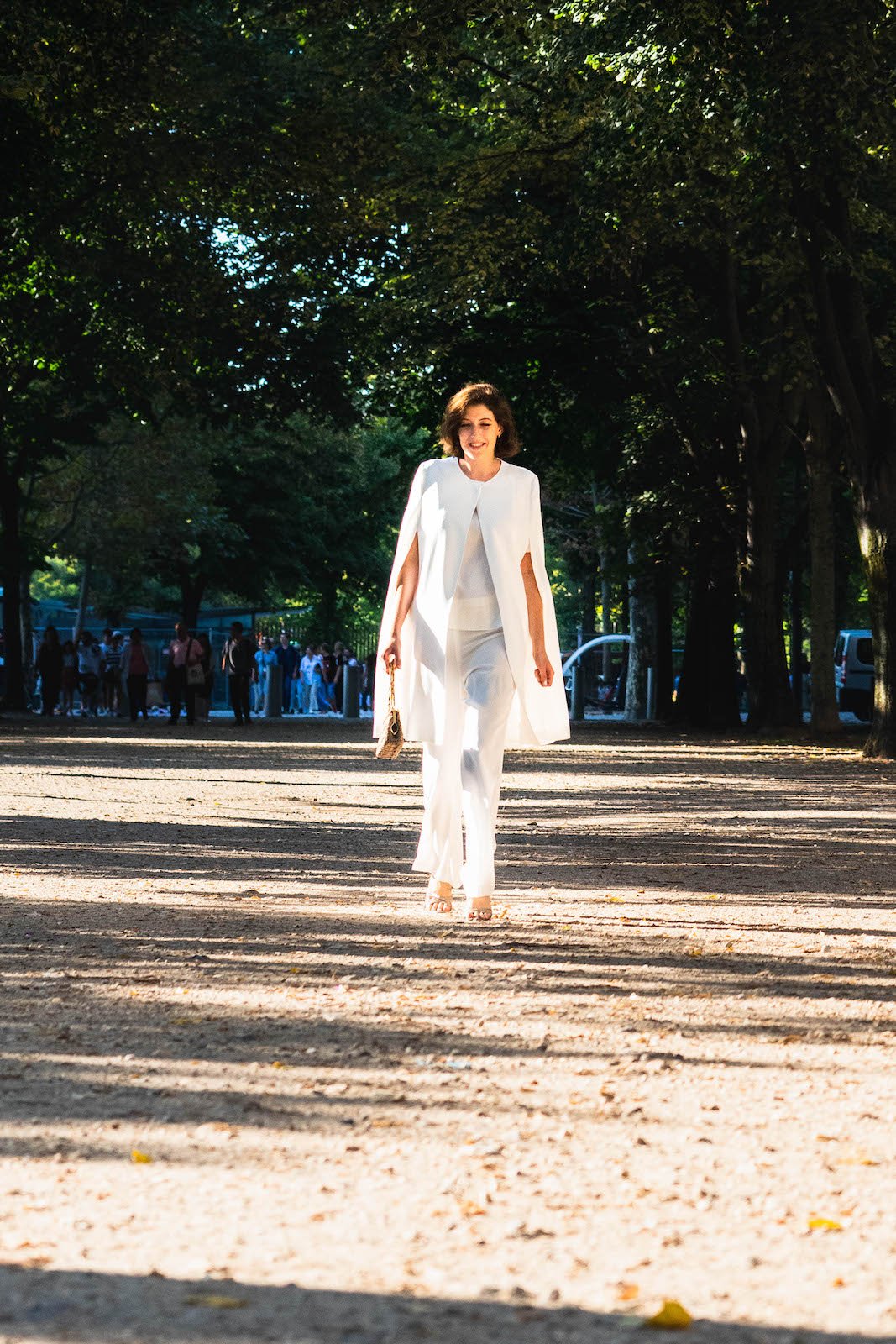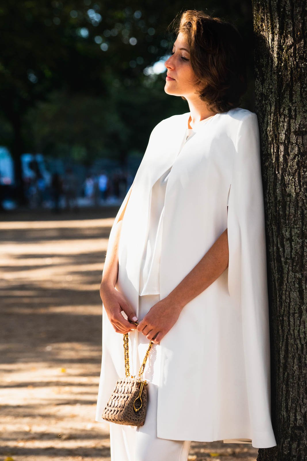 Elégante Cape longue HIRONI en crêpe ivoire et Pantalon COPRA fez ivoire