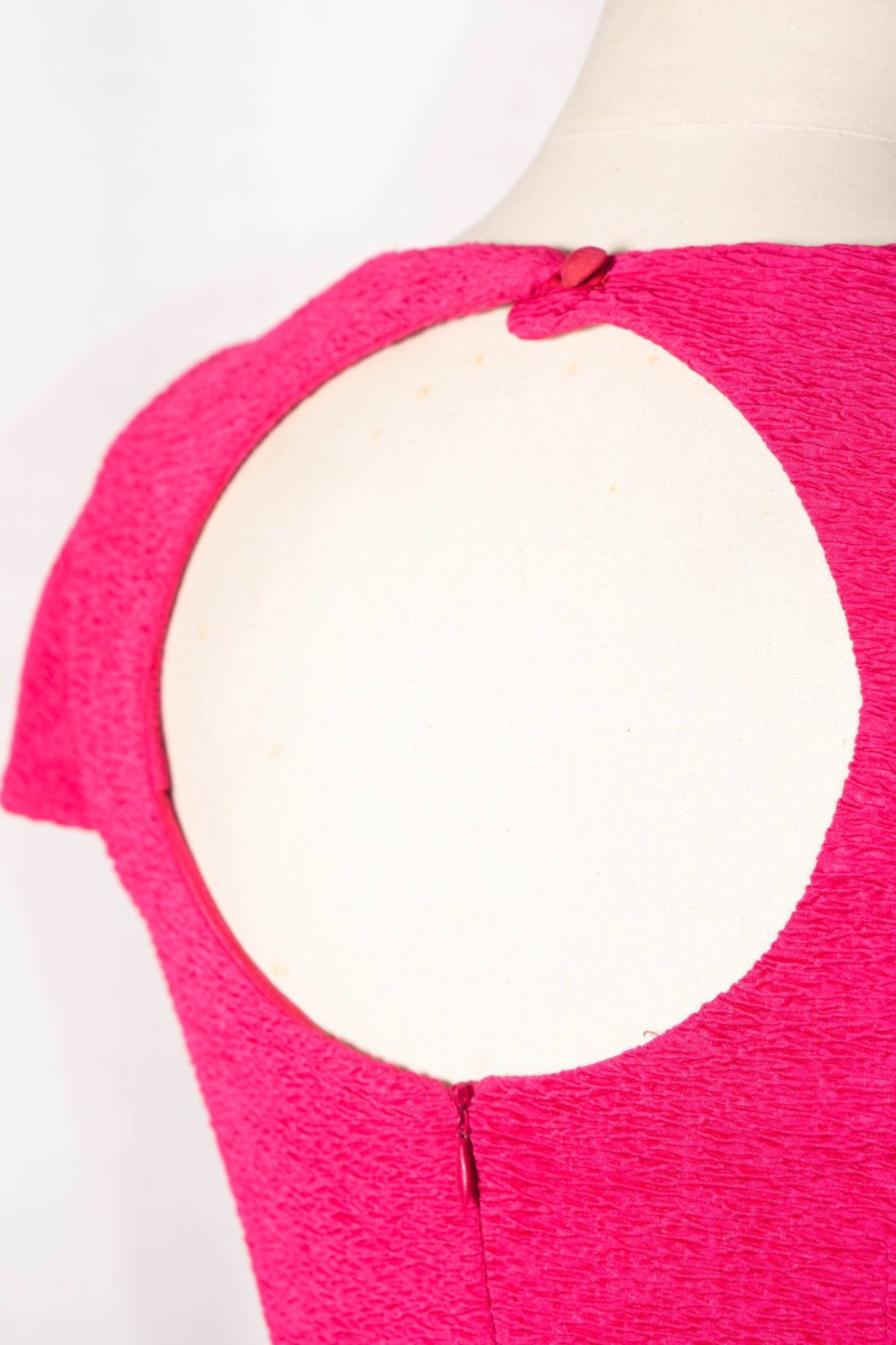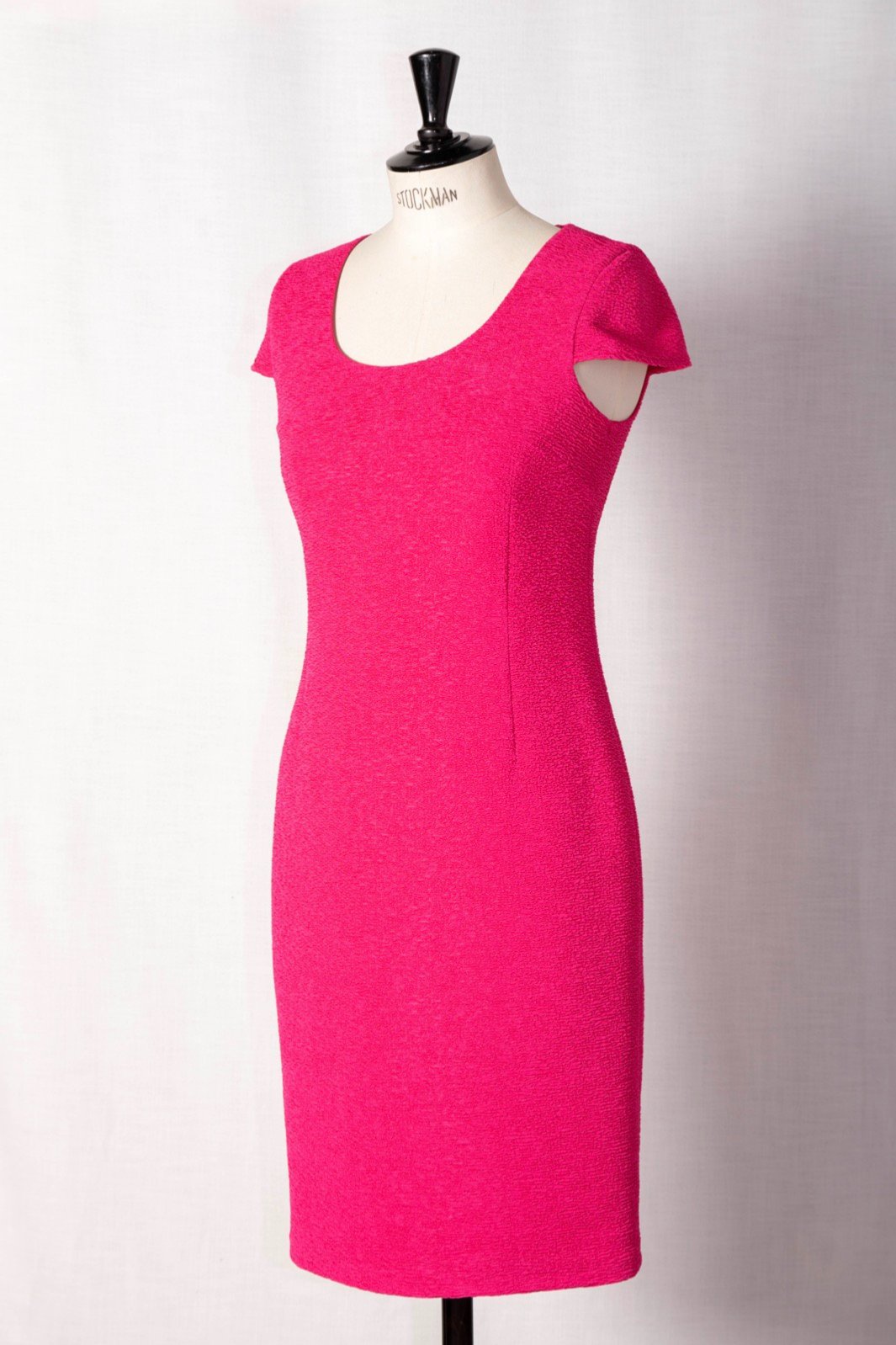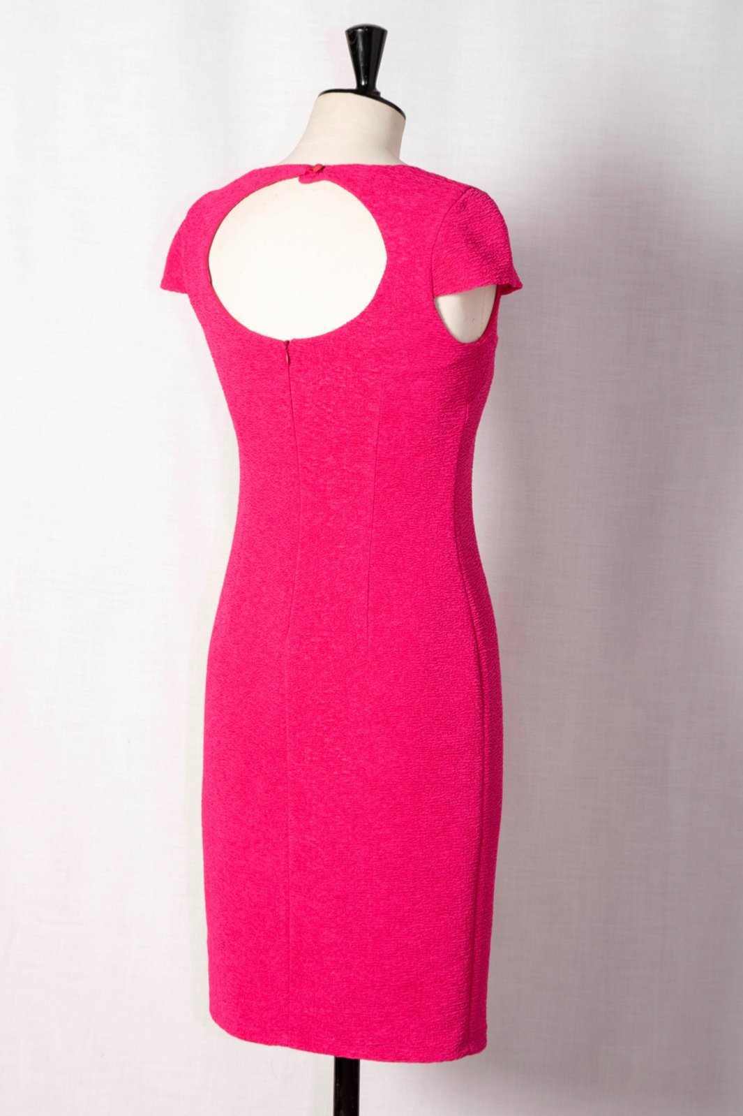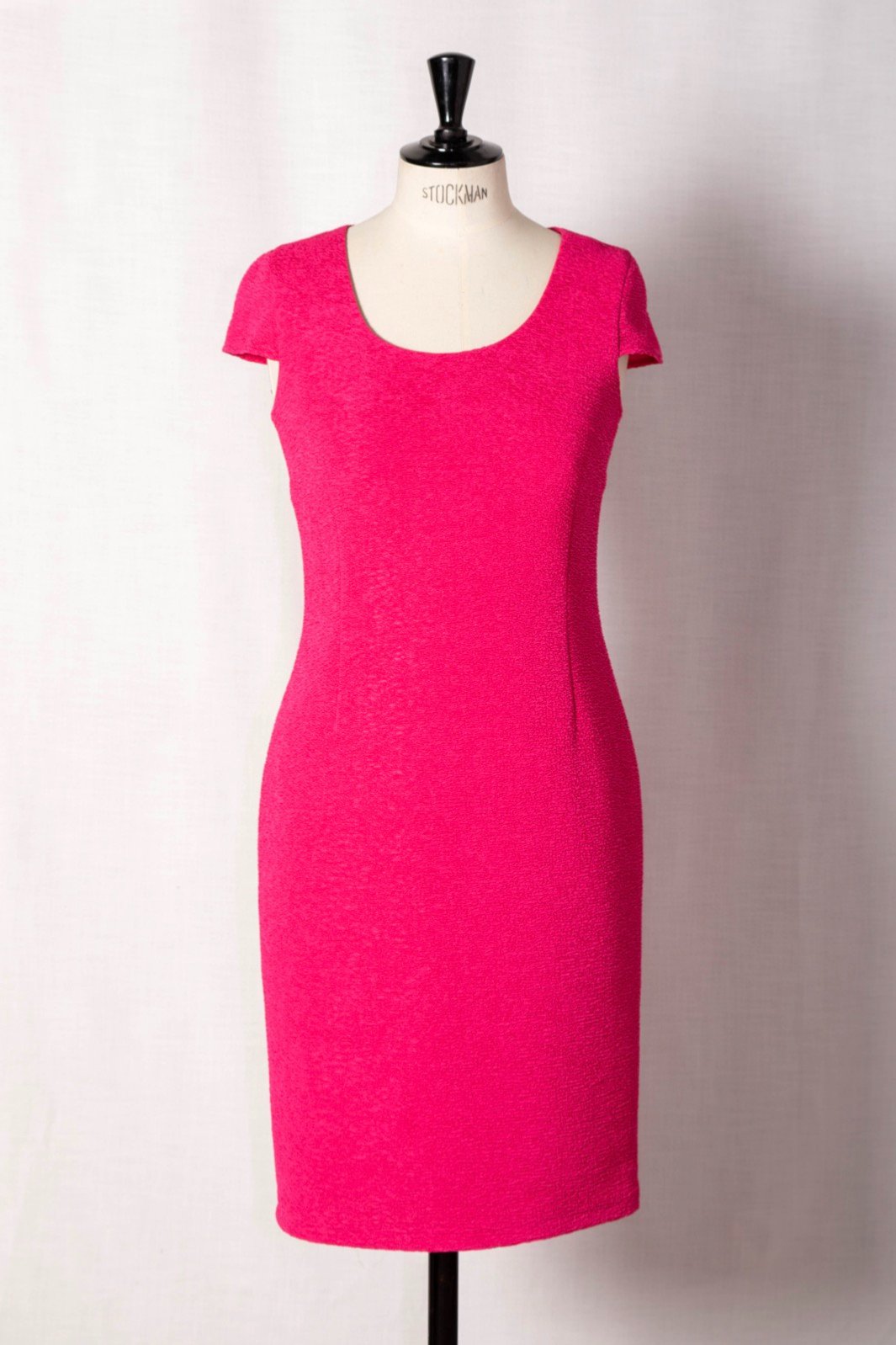 Pour un mariage civil ou pour un cocktail romantique, cette robe raffinée est en crêpe coloris framboise, couleur tonique