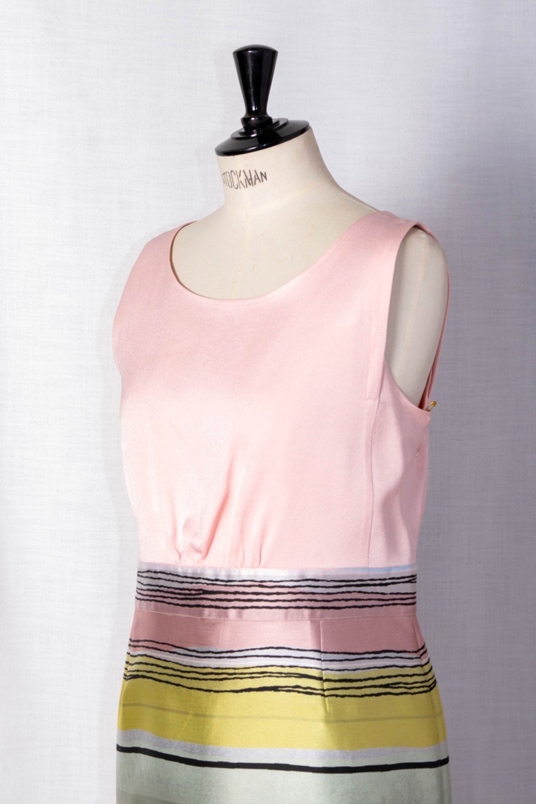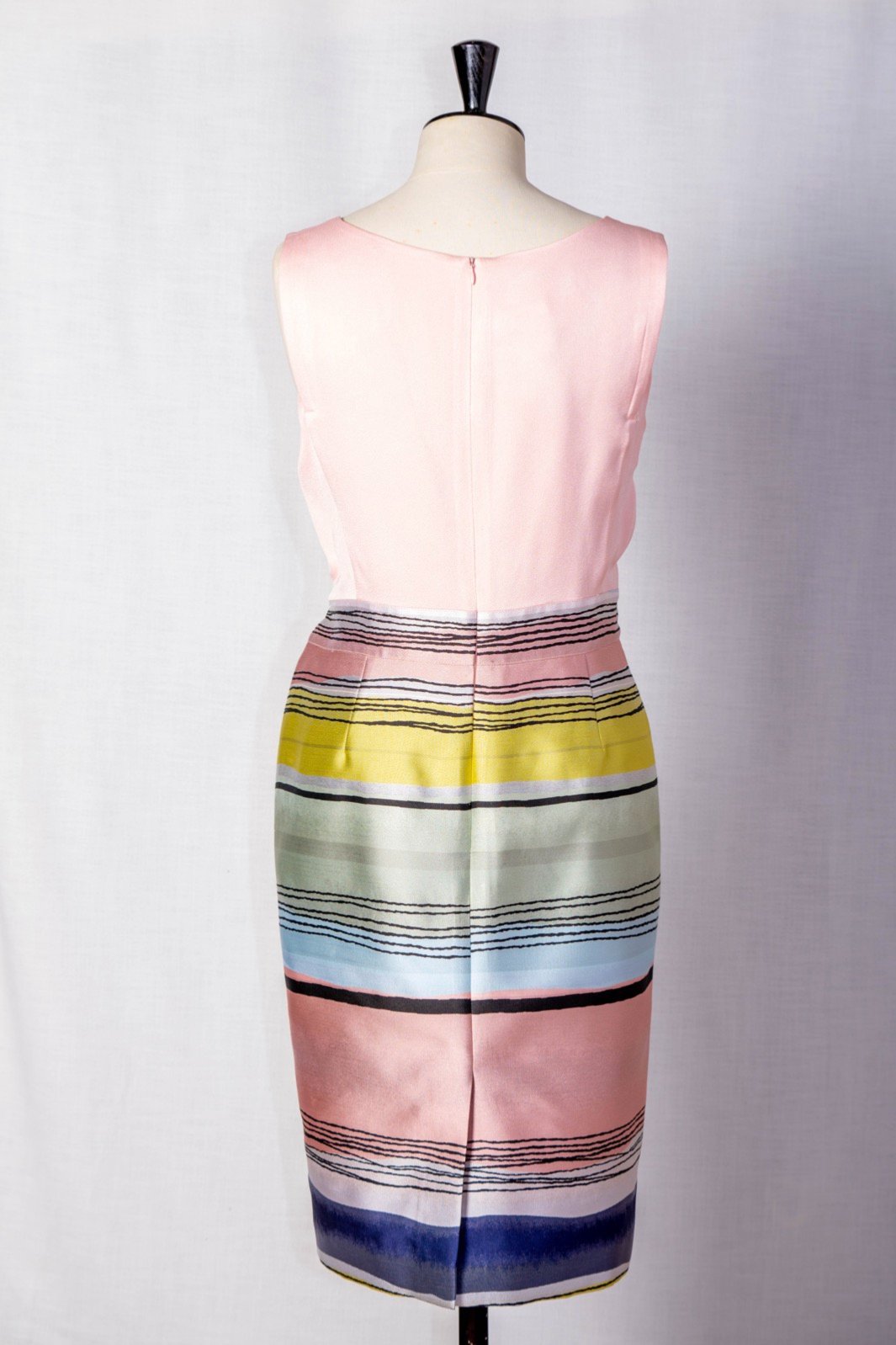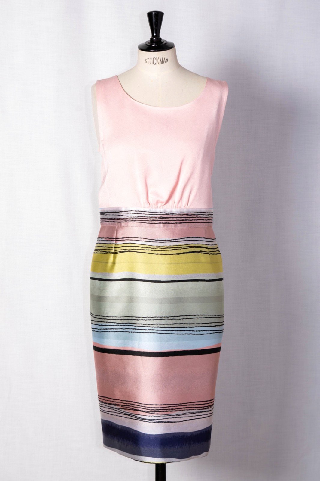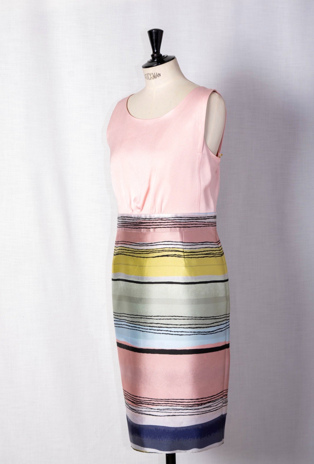 Superbe robe à encolure découpe cœur ultra féminine. Parfaite pour un cocktail ou une soirée habillée, cette robe courte à petites manches combine un crêpe doux et souple à une rayure jacquard en soierie dans un esprit très coloré, coloris dragées.