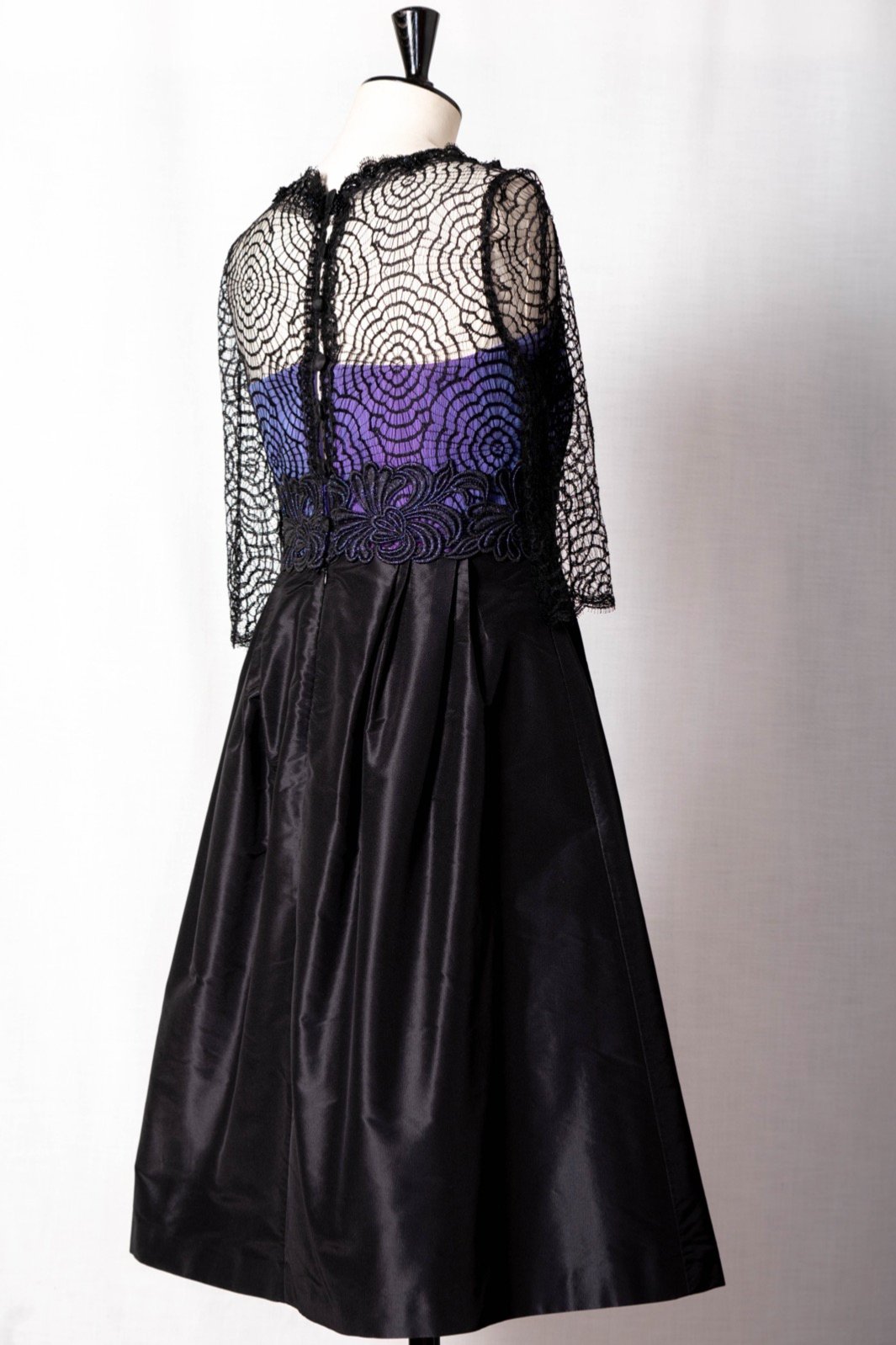 Magnifique robe courte à belle encolure et manches trois-quart en dentelle de Calais-Caudry.