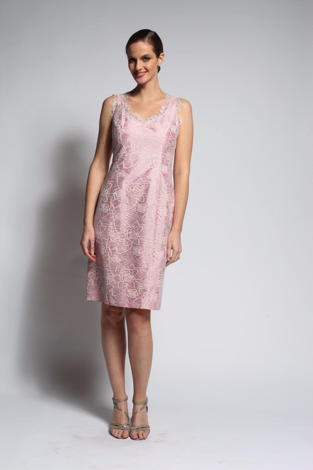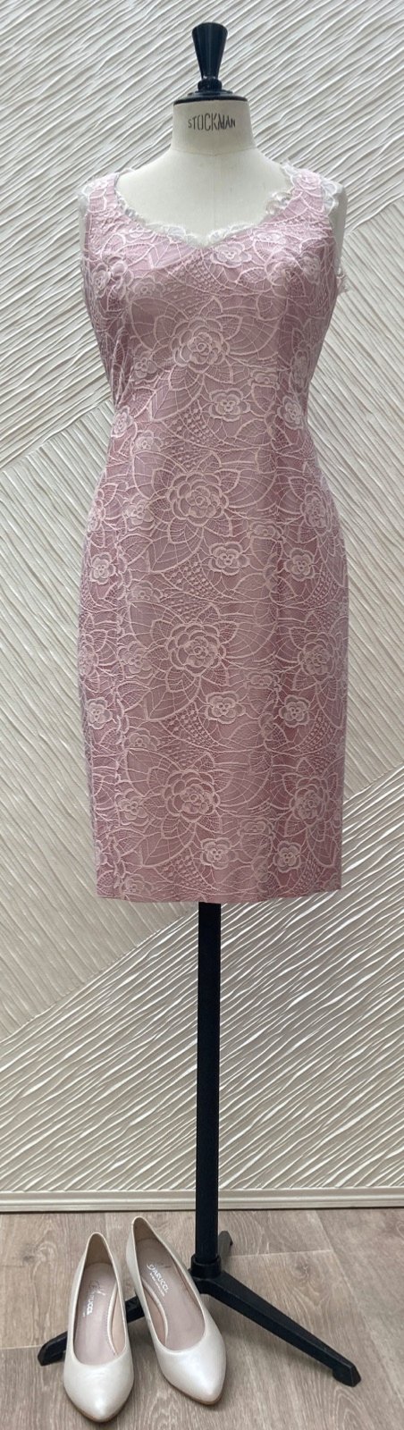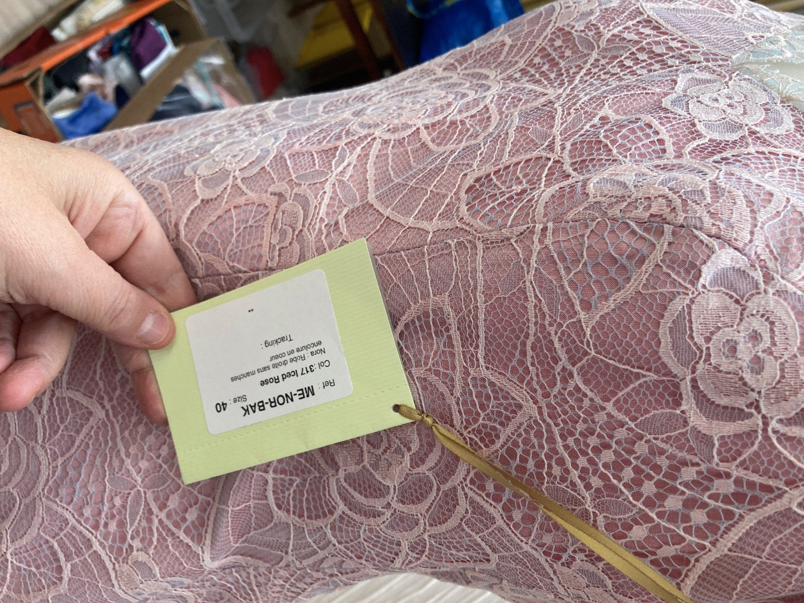Cette robe est faite avec du Shantung de soie en fond de robe et de la dentelle de calais bicolore rose et ciel sur le dessus.