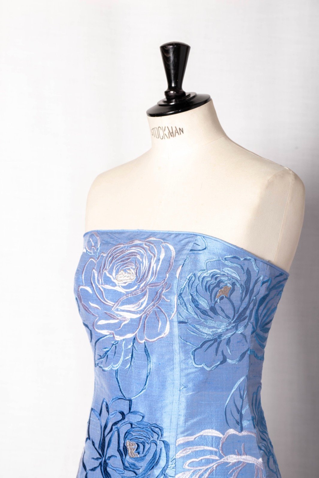Cette magnifique robe de cocktail bleu faïence est une robe bustier en soie sauvage rebrodée.