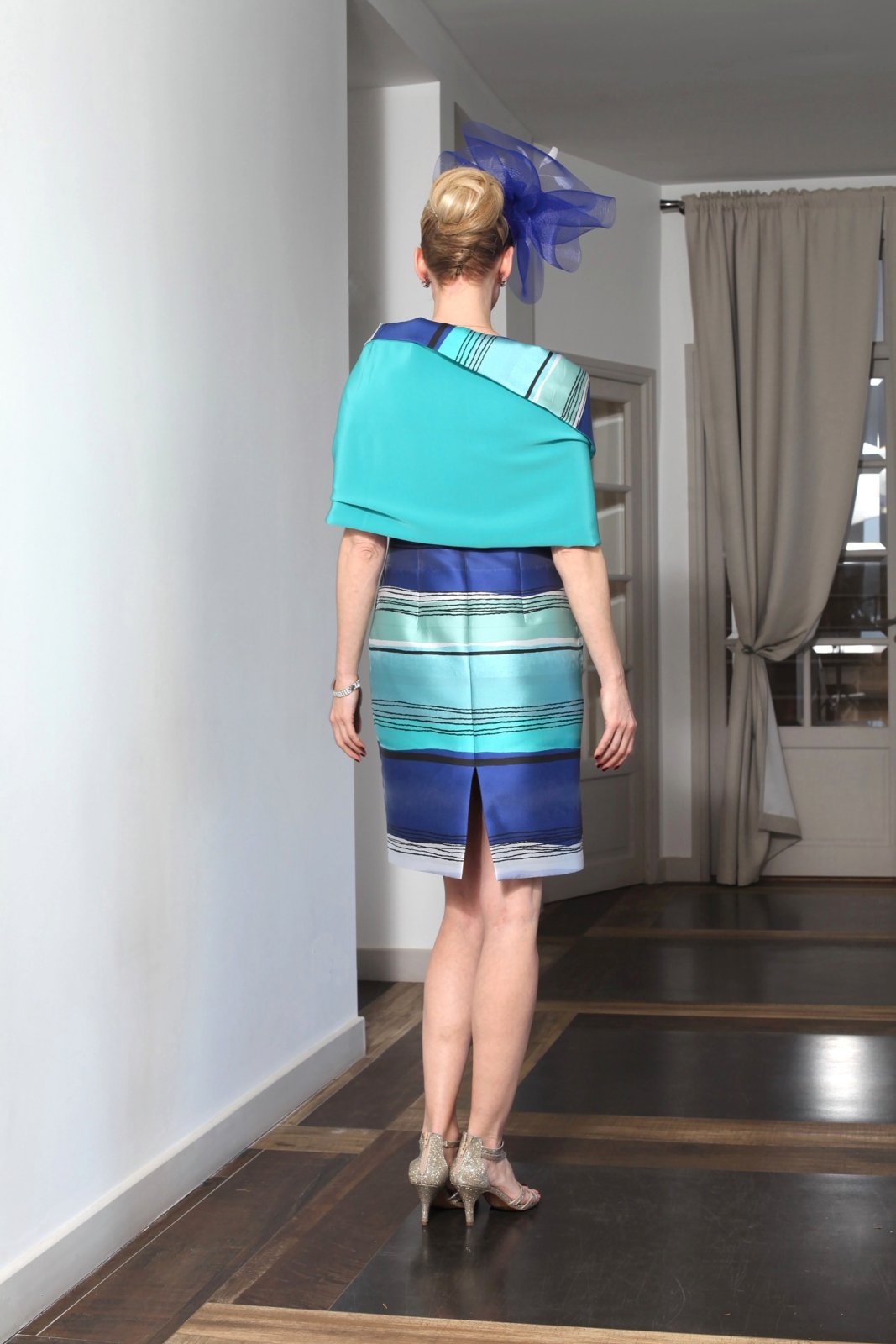 Cette robe saccompagne dune large étole réversible pour couvrir les épaules. En crêpe émeraude reprenant les tons de la rayure, cette étole peut aussi se coordonner à une robe unie.