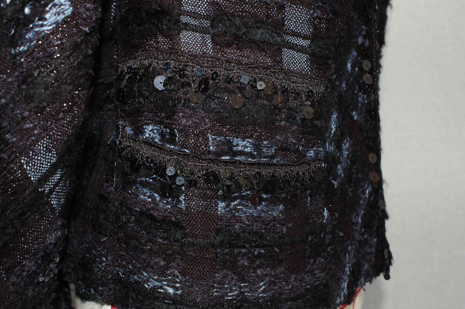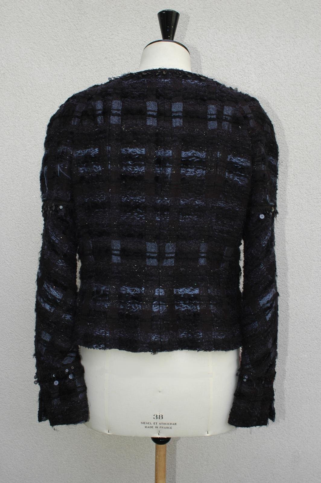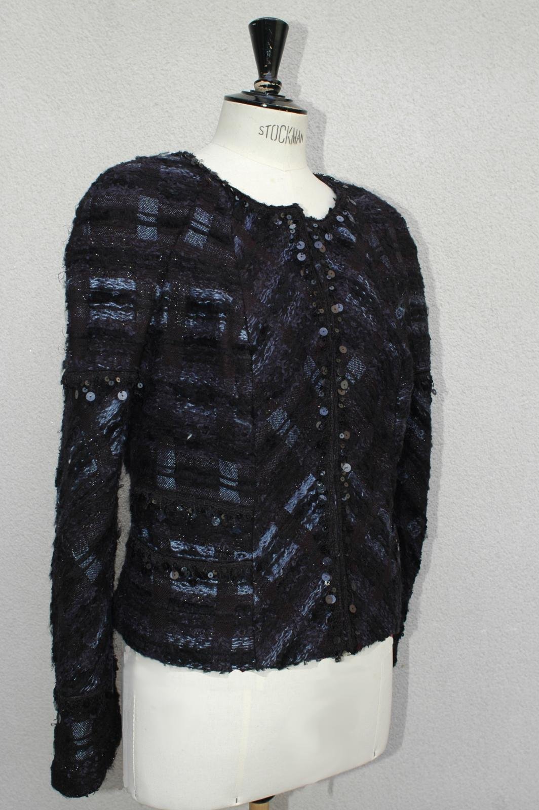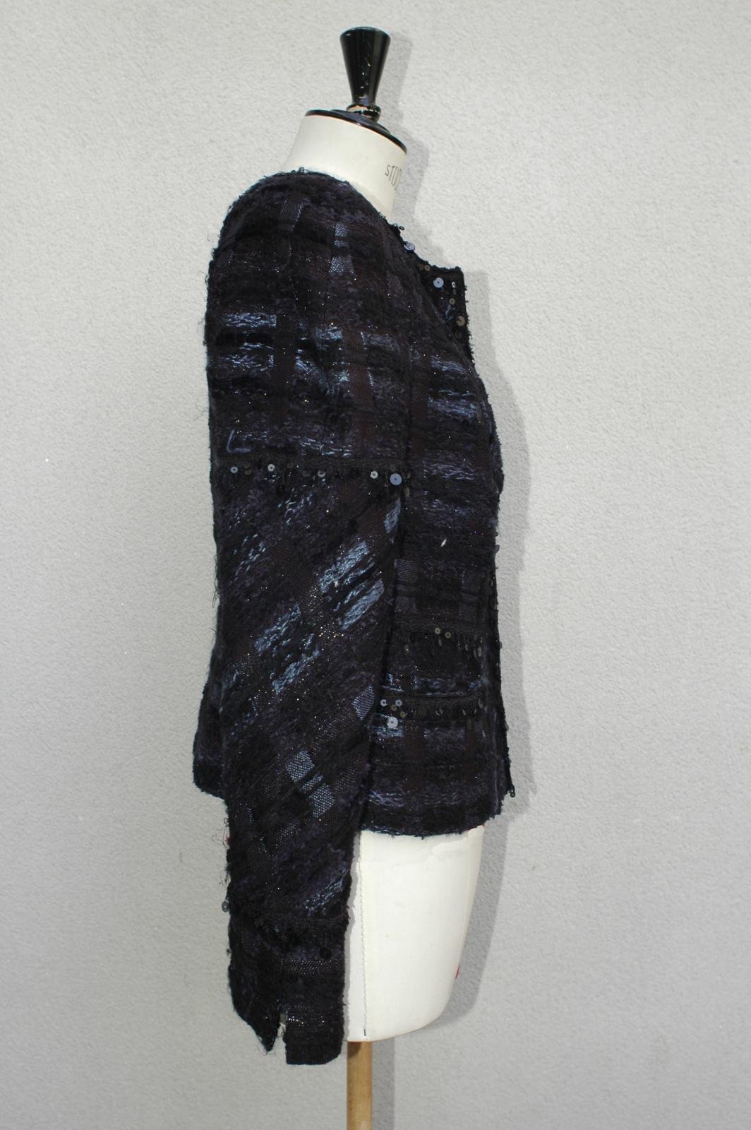 La veste est en tweed de coton et soie .Le col arrondi et couture de la veste est parfaite pour mettre en valeur votre décolleté et un collier .