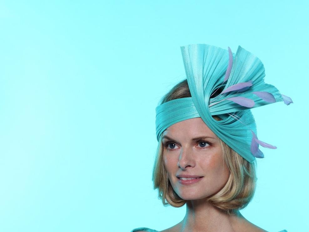 Le turban en banane plissée est orné de plumes parme et donne un ton années 20’ à cette tenue.