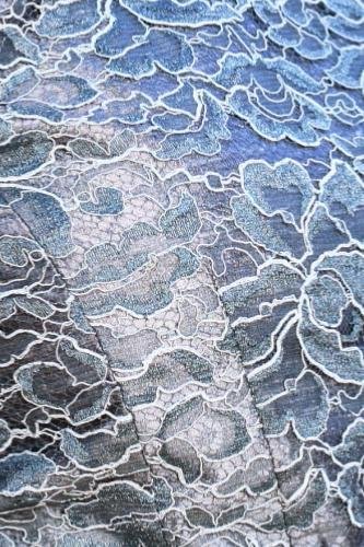 Cette robe est fabriquée avec de la soie changeante argentée et de la dentelle de Calais bicolore tissée en France.