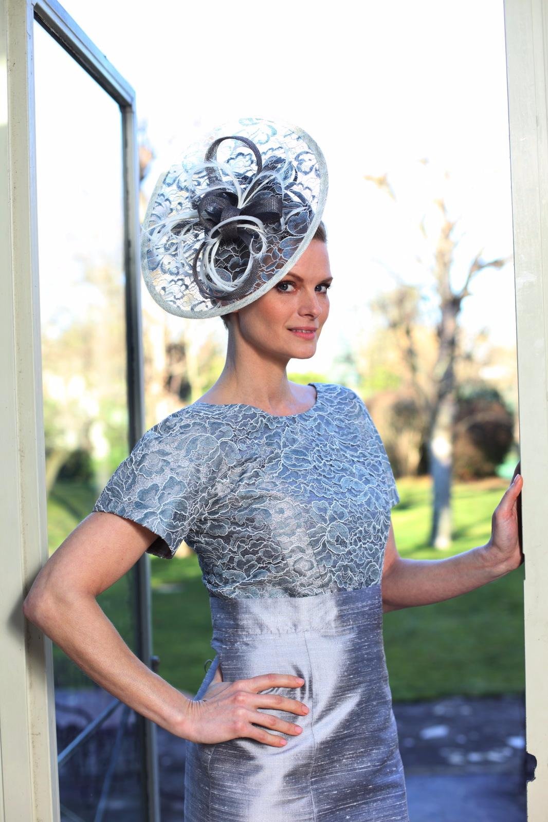 Cette ravissante robe a été coupée dans une magnifique soie argent, le haut de la robe est entièrement recouvert de dentelle de Calais argent et ivoire. C ‘est une robe idéale pour un mariage élégant.