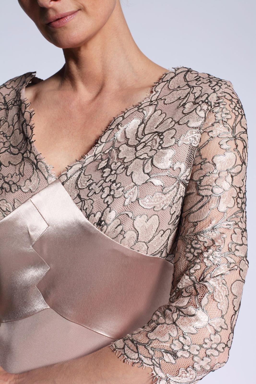 Cette ravissante robe a été coupée dans un magnifique crêpe marocain envers satin, le haut de la robe est entièrement recouvert de dentelle de Calais du même ton nude recouvert de feuille d’ or vieilli.