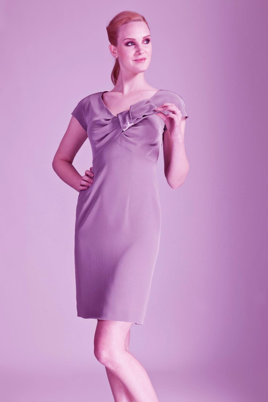La robe est cintrée, avec des manches kimono. Un effet croisé à la poitrine par noeud double souligne le beau décolleté en V .