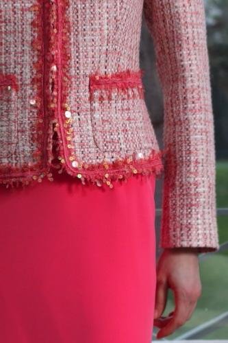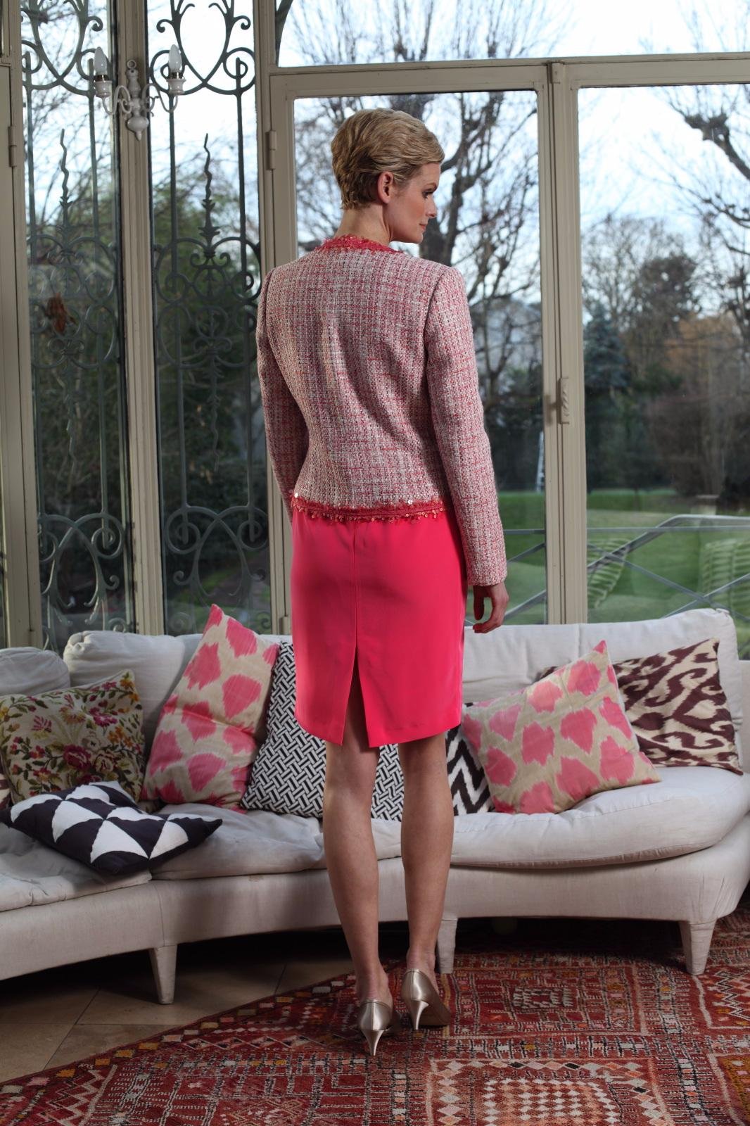 La veste est coupé en crêpe marocain envers satin haute couture et les boutons bijoux sont en cristal de Swarovski.