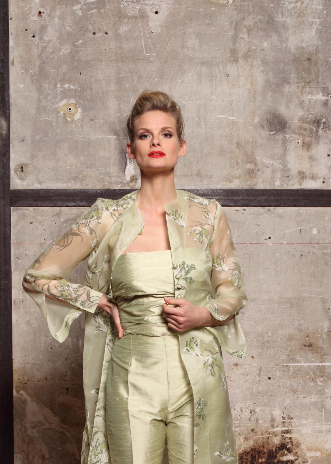 Le manteau est en organza de soie imprimé et vous donnera une silhouette très allurée.