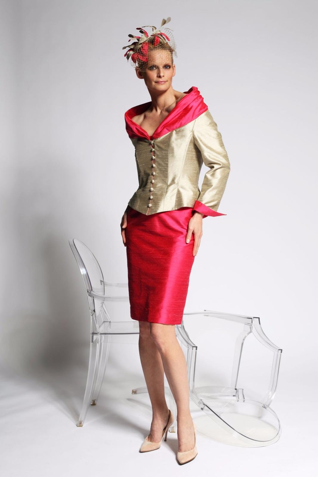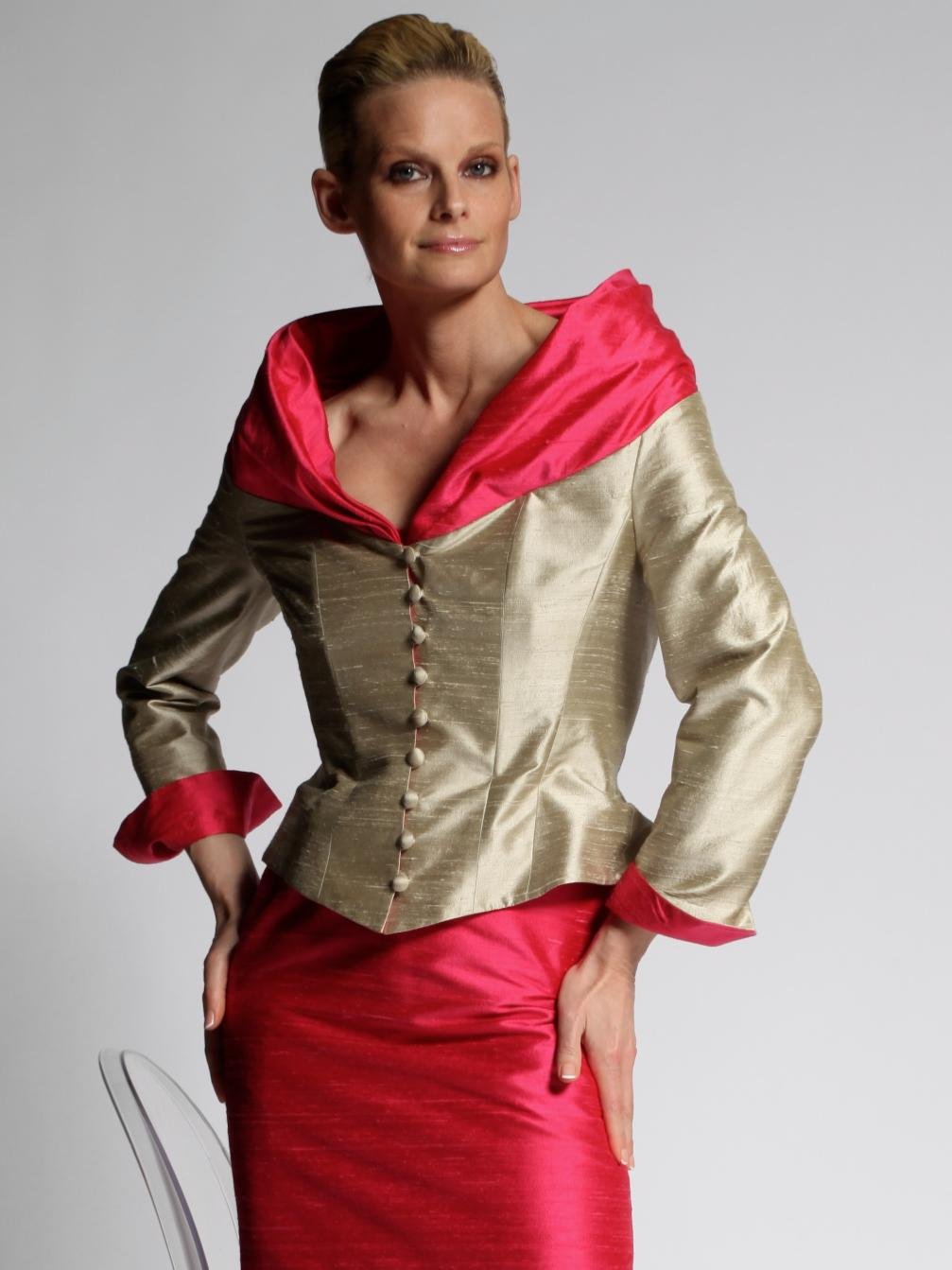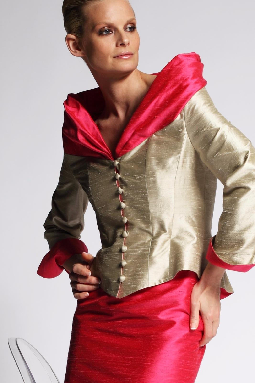 Veste VOX : Shantung de soie bicolore içi présentée avec une jupe droite Moderato ou avec la robe Abaca ou aurore