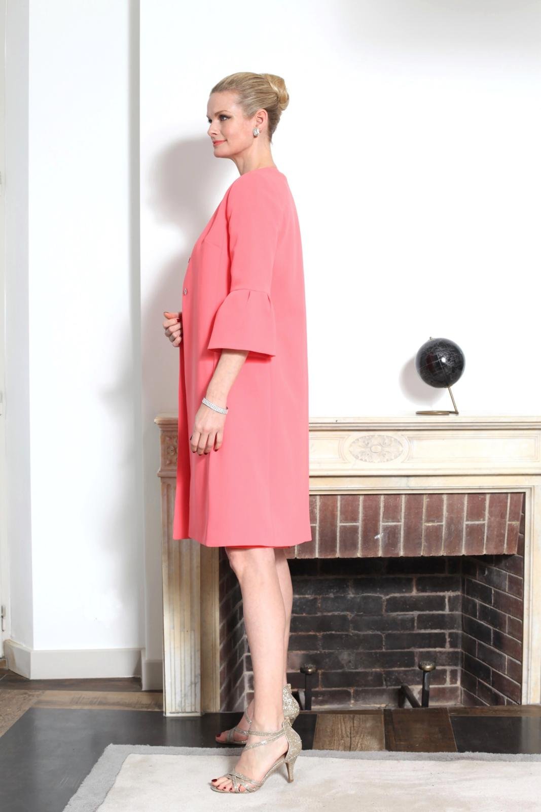 Boutonnage à pression et belle encolure arrondie pour accompagner une robe de cocktail coordonnée esprit tailleur robe.
