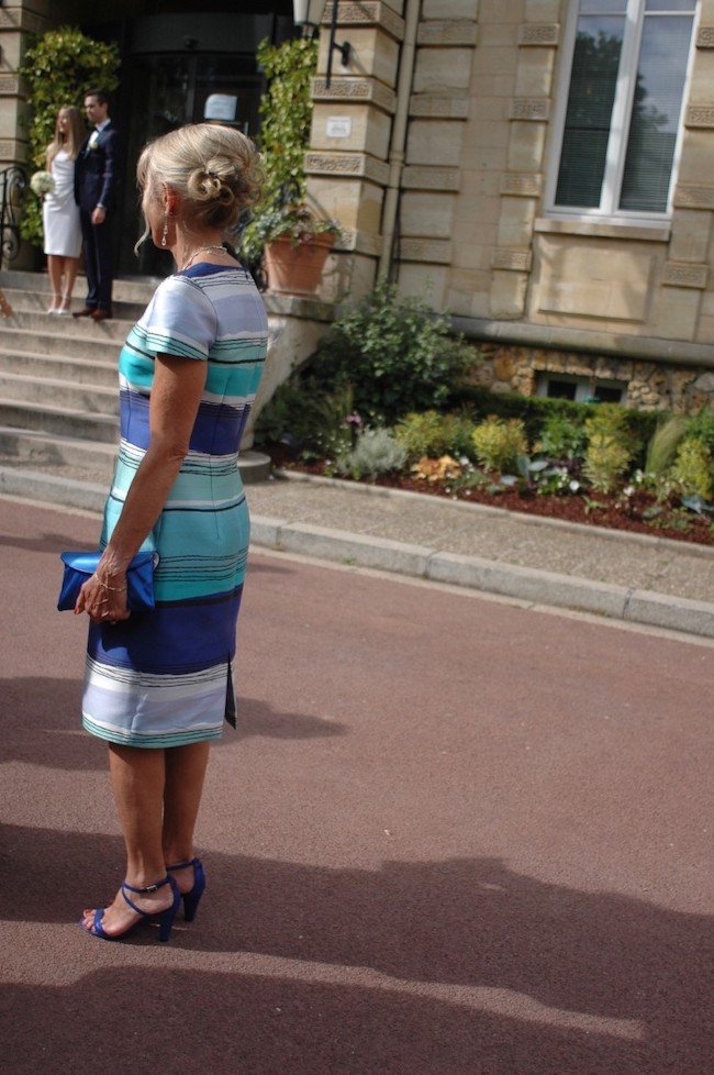 La robe « Tzarine » en jacquard rayé épouse parfaitement la silhouette de la maman de la mariée.
