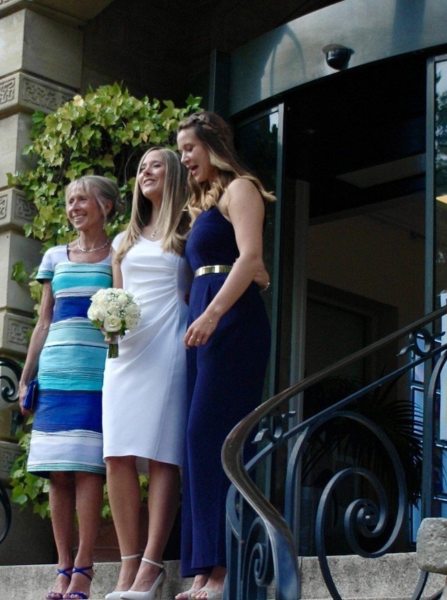 Magnifique photo de la mariée accompagnée de sa mère et de sa soeur. Sur cette photo nous voyons les différents détails des robes : le beau drapé style Grèce antique de la robe de mariage et l’élégante robe aux rayures bleues irrégulières.