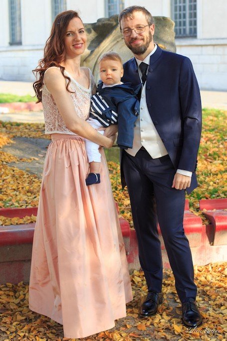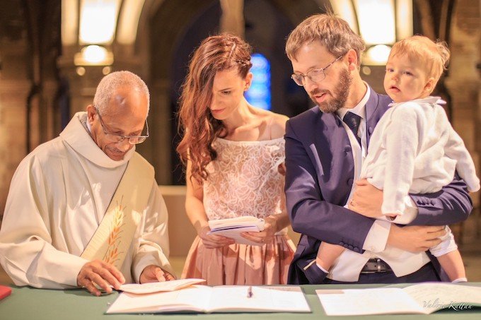 Romantique photo du couple de mariés accompagné de leur fils.