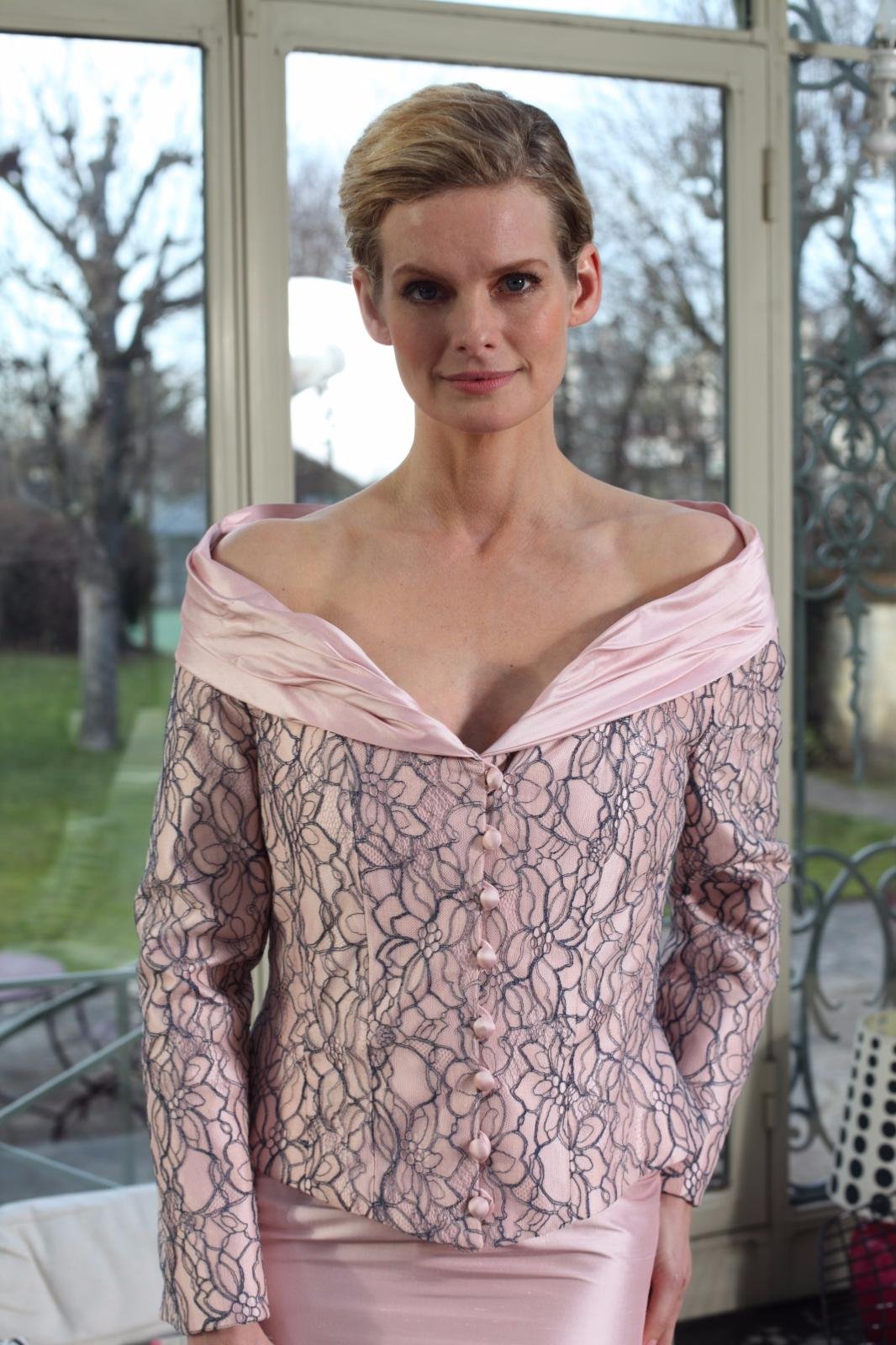 Ce magnifique tailleur habillé est composé d’une veste originale corsetée à manches longues. Entièrement recouverte de dentelle de Calais pour une veste de mariée très élégante et féminine, dans le plus pur esprit Marie Antoinette. Avec sa petite basque arrondie, sa coupe esprit corset vous assure une silhouette à la taille fine et son grand col mettra en valeur votre décolleté.