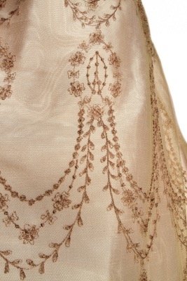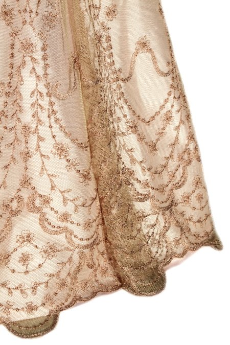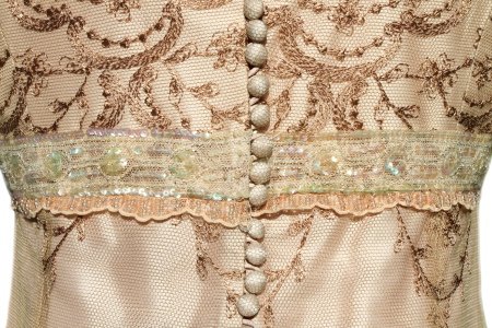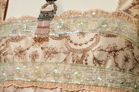 La diffraction de la lumière sur ces jolies petites paillettes produit de multiples petits arcs en ciels jouant avec la soie rose poudrée et les fils vieil or du tulle délicat .Il fut choisi aussi pour ourler délicatement le décolleté une petite écaille de dentelle se calait redessiné par de légers fils de perles de rocaille rose opalescent du célèbre dentellier français SOLSTISS.