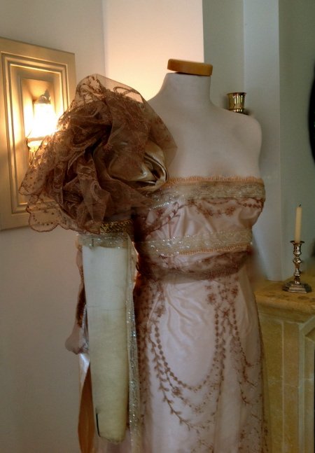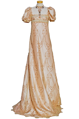 Joséphine de Beauharnais aimait bien sûr beaucoup les bijoux comme toute femme coquette. Il était donc impensable de présenter cette robe sans collier, finition indispensable d’une robe empire.