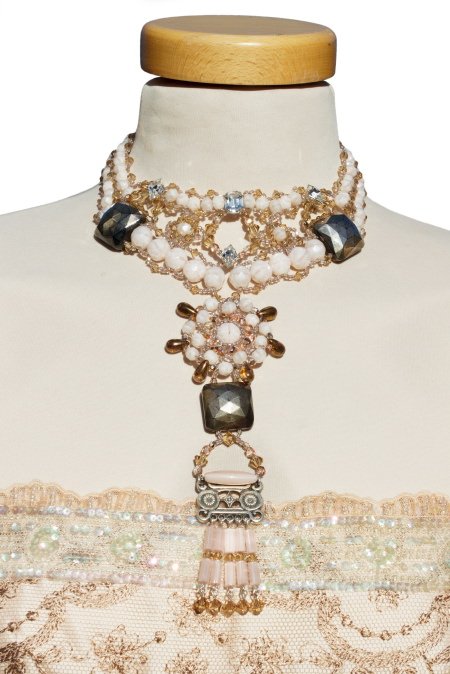 Karine a cherché dans ses réserves et ses merveilles. Je me souvenais d’une très belle pièce que Karine avait réalisée, il y a quelques années pour orner une de mes mariées, ce collier est éblouissant de magnificence, il nous a servis de base de réflexion.