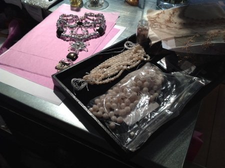 Karine m’a présenté des cabochons anciens en jais argenturés encore provenant de la maison BARLAN, de jolies perles en pâte de verre, des cristaux de bohème et une rocaille cordonnée à l’écaille de dentelle du décolleté. C’est ainsi que l’on travaille en tant qu’artisan de la couture et haute couture.