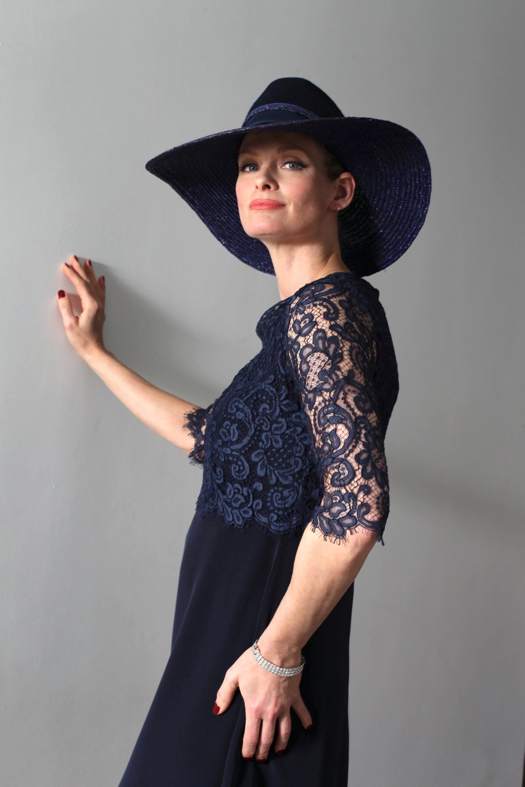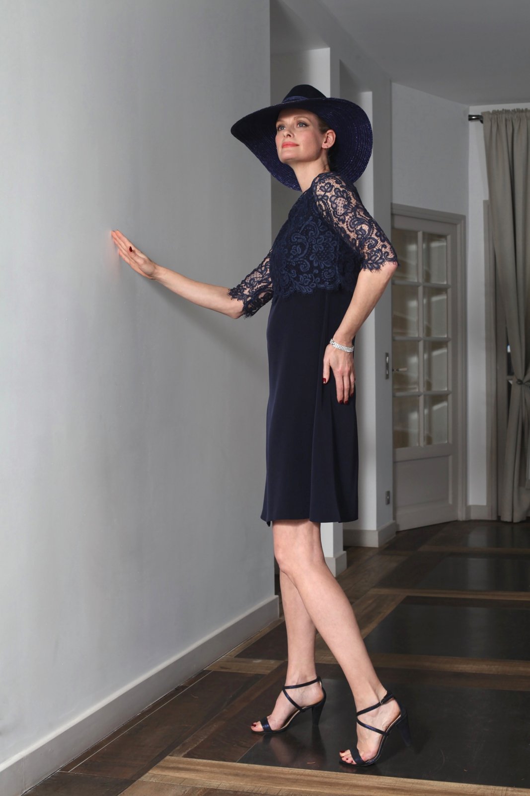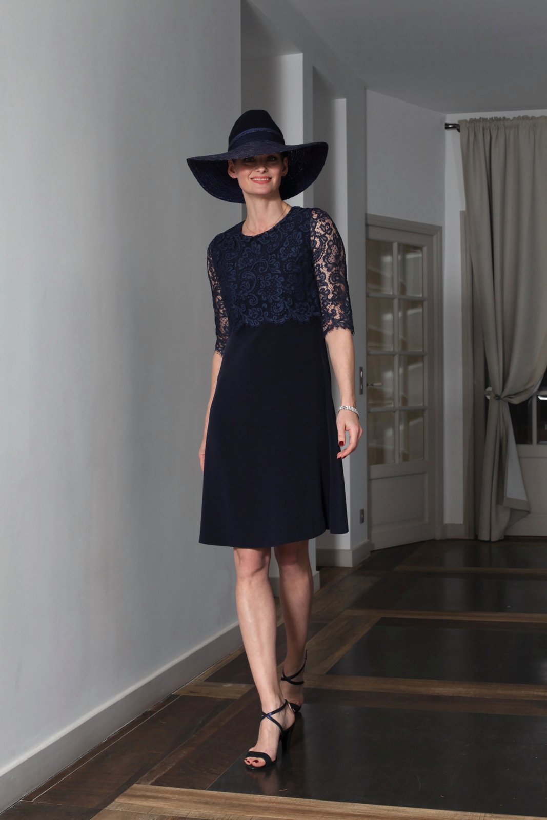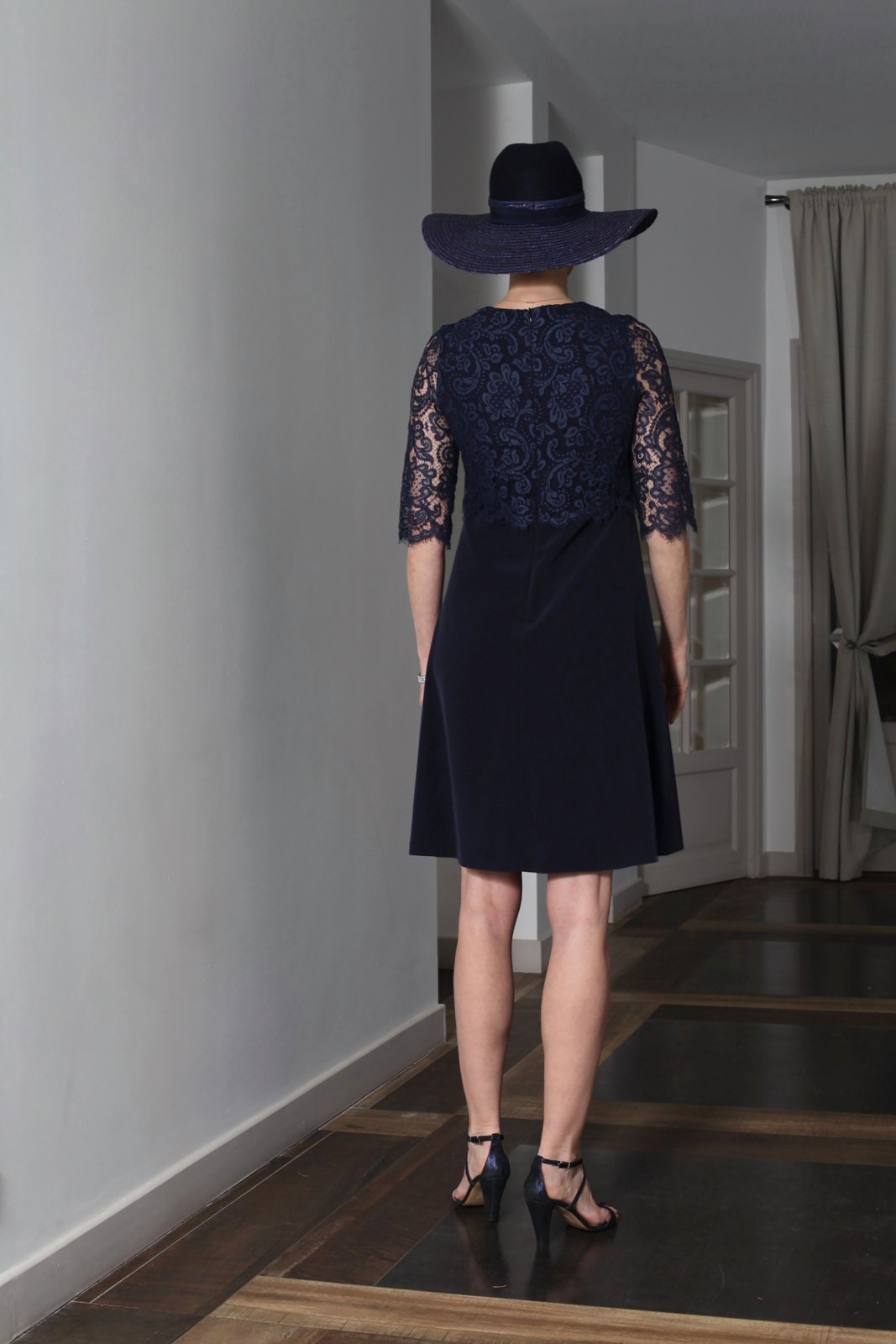 Très belle robe courte élégante, légèrement évasée, à encolure ronde avec un effet superposé de top à manches 3/4 en dentelle de Calais-Caudry zippée dans le dos.