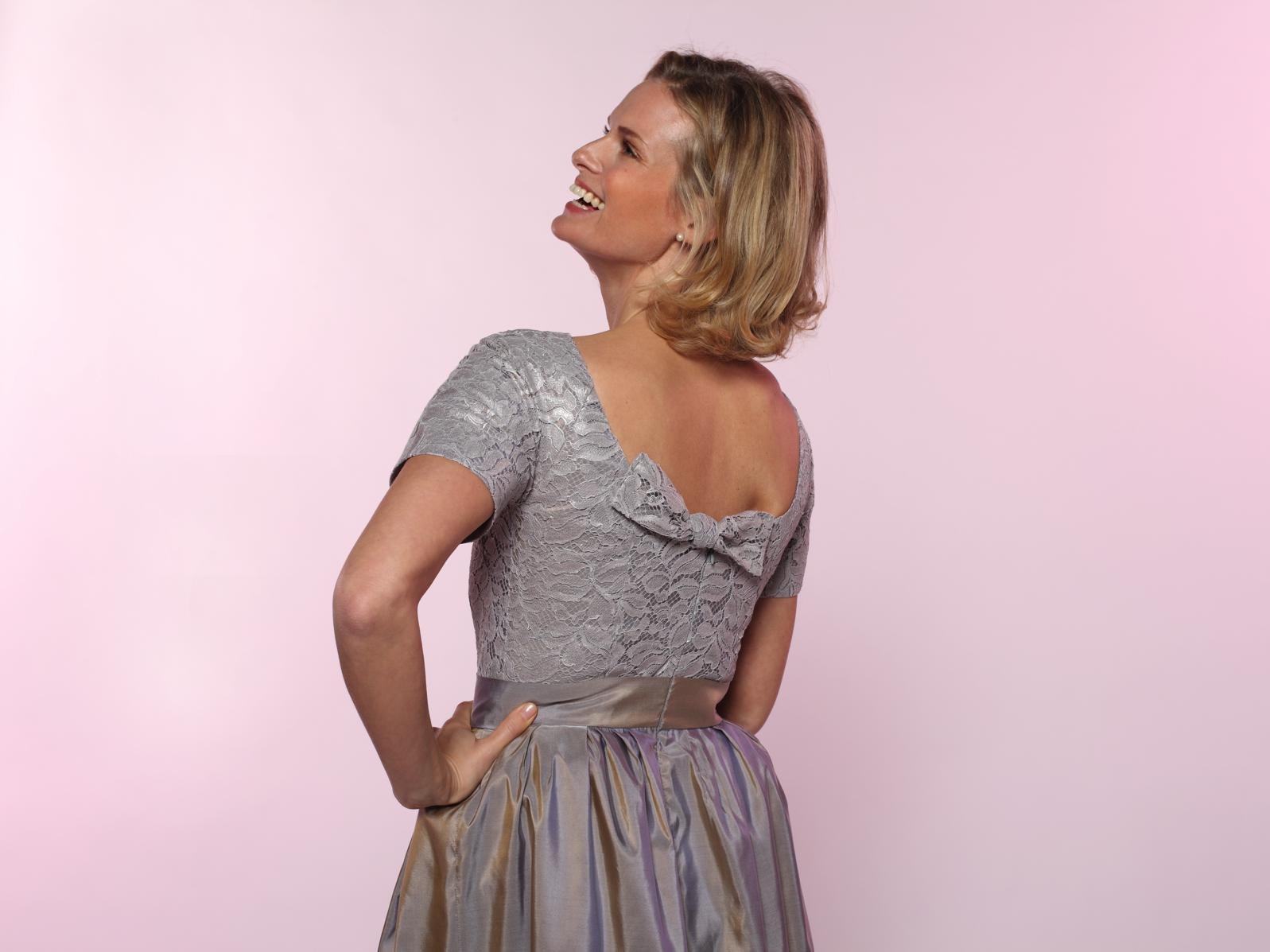 La robe est en taffetas de soie changeant, le haut de cette robe couture est recouvert de notre dentelle de calais argentée et est confortable pour pouvoir danser.