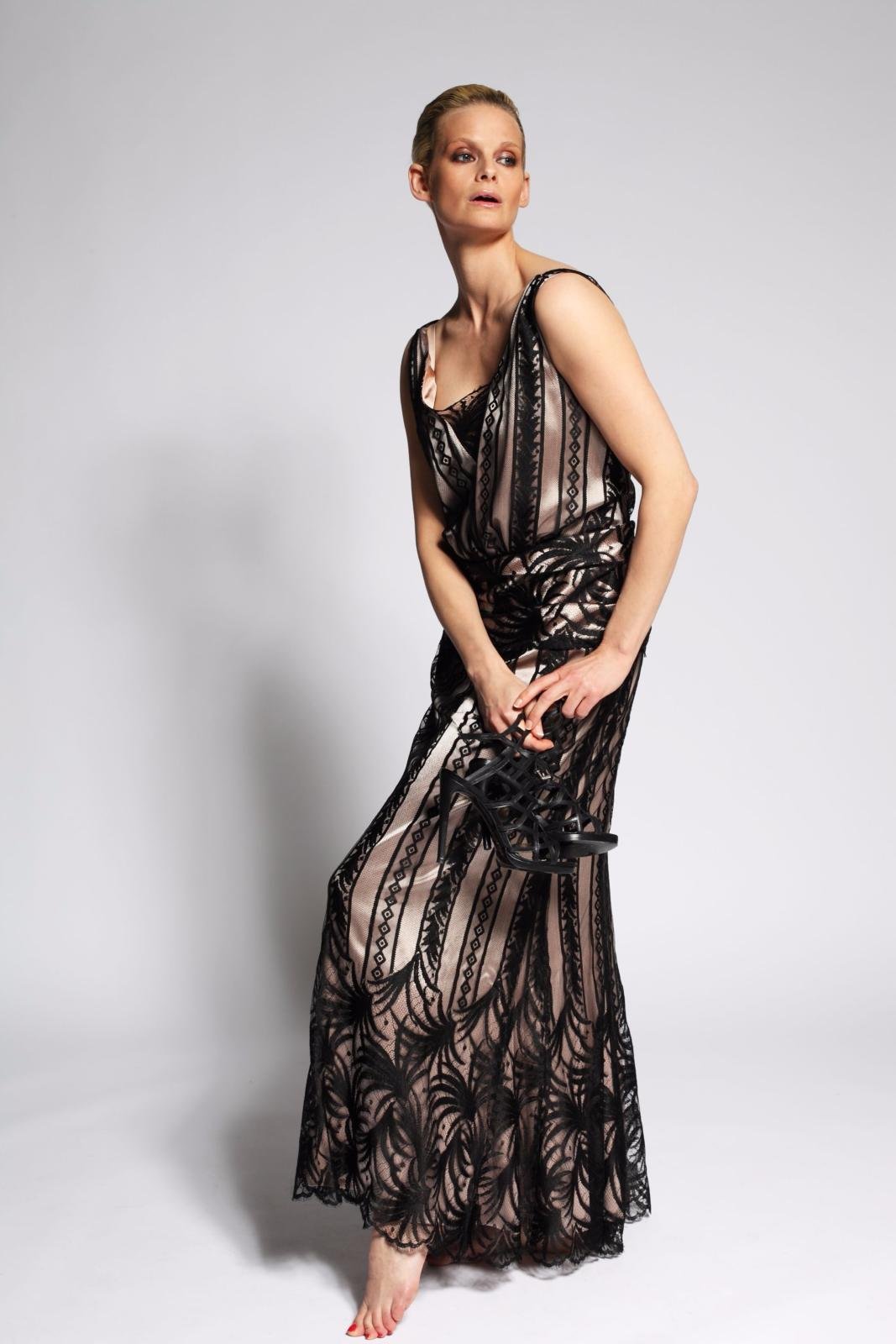 Robe MYLIE : crêpe marocain envers satin entièrement recouvert de dentelle de Calais esprit années 20′