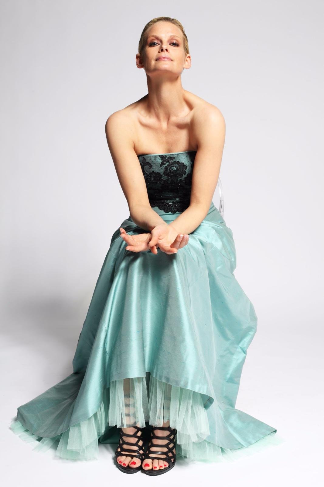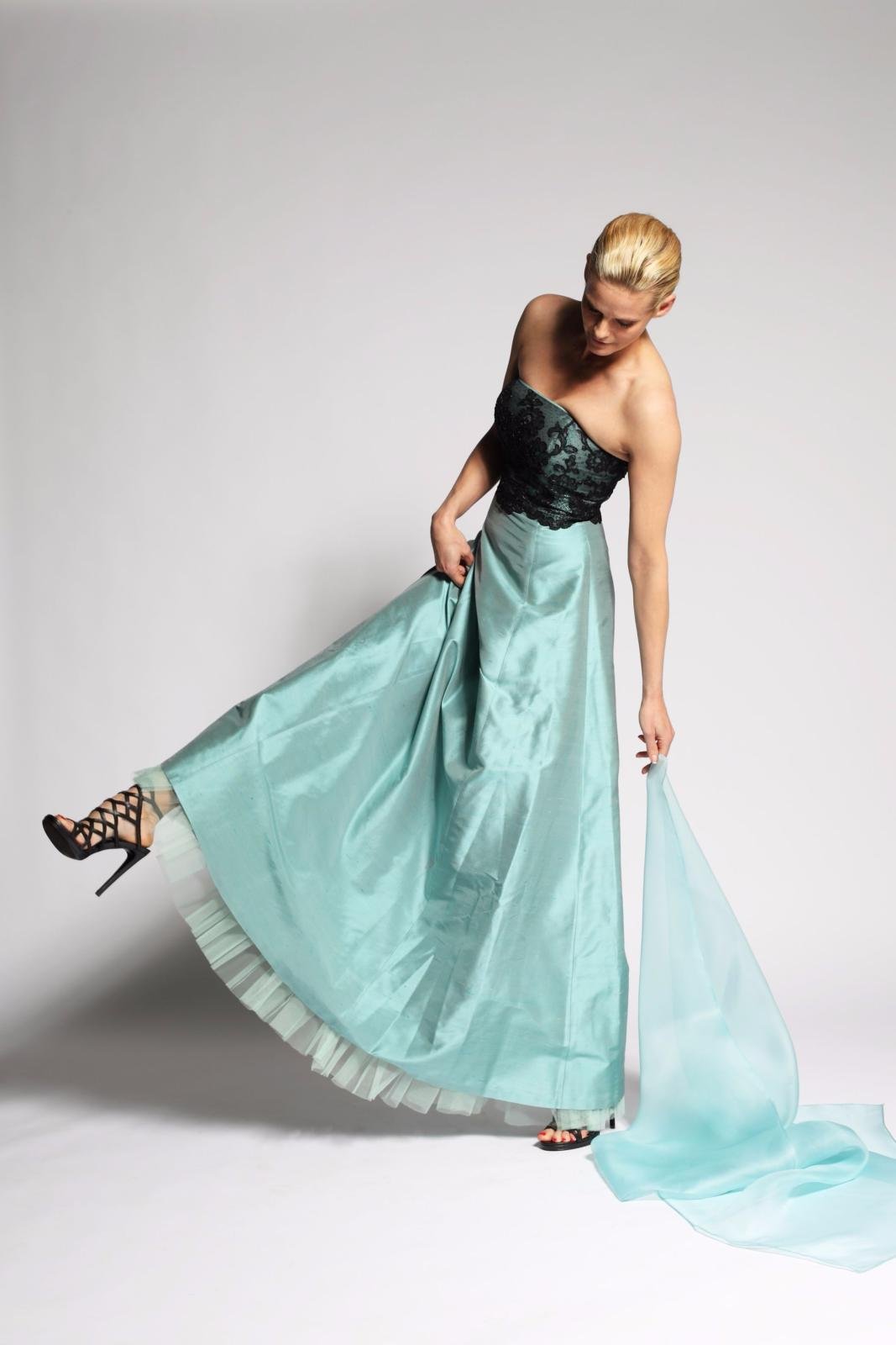 Sublime robe longue en soie avec bustier recouvert de dentelle de Lyon noire. Gand jupon en tulle et belle ampleur pour un style princesse intemporel revisité.